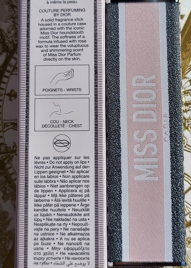 Именно этот вариант парфюма был взят для переработки в стик, твердый парфюм Dior Miss Dior Blooming Bouquet Mini Miss solid perfume. Важно, что состав стика без спирта, если у вас чувствительная кожа и не менее, чем 80% состоит из натуральных компонентов.