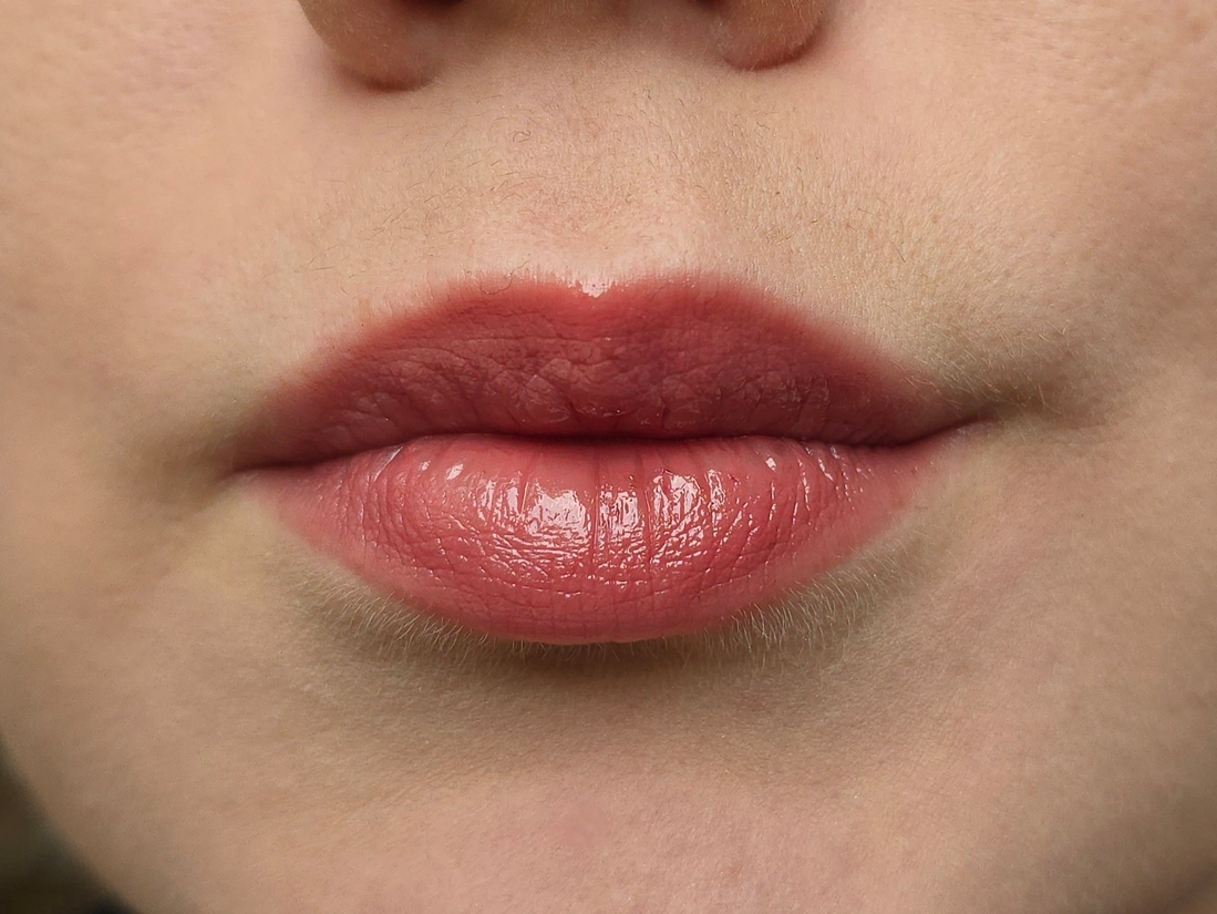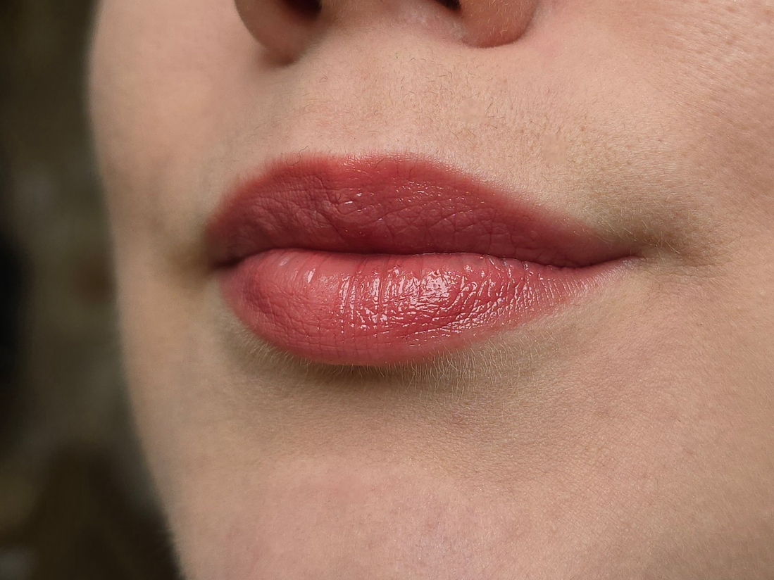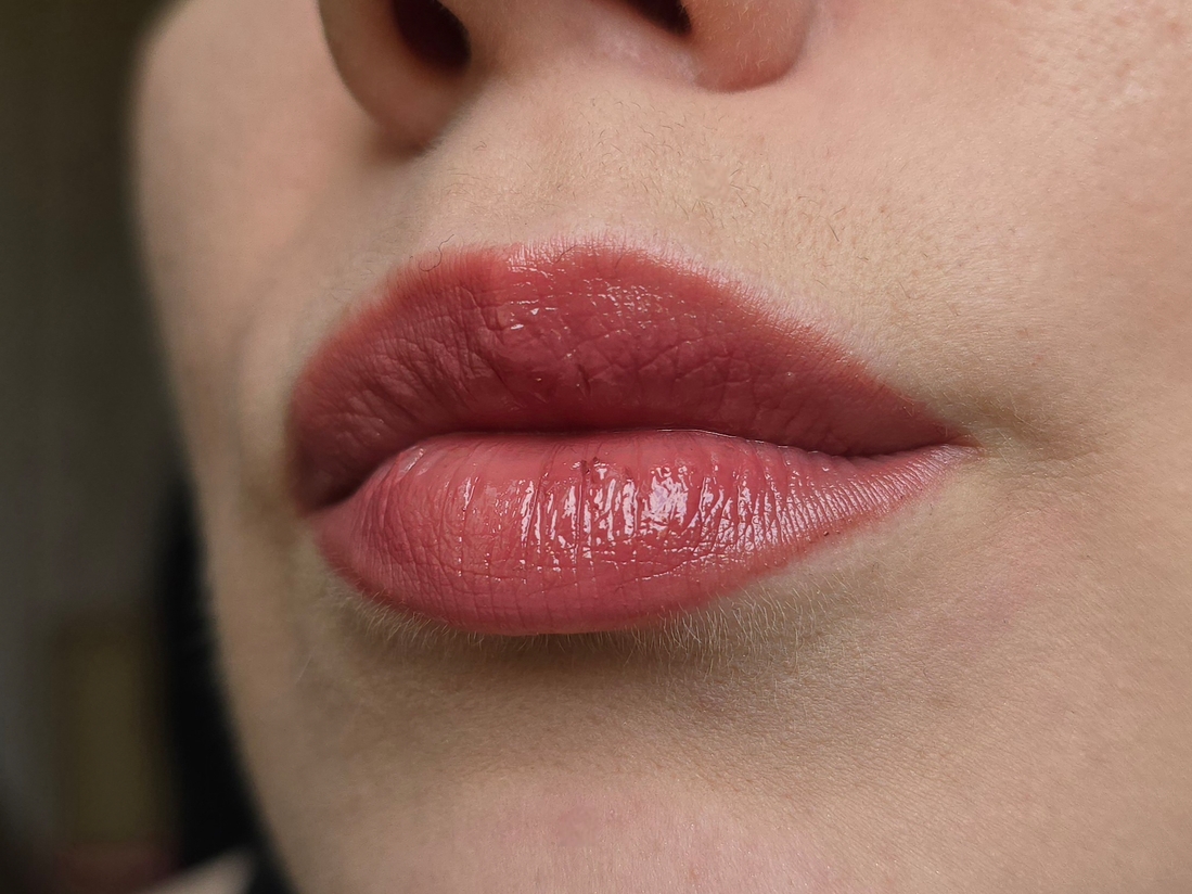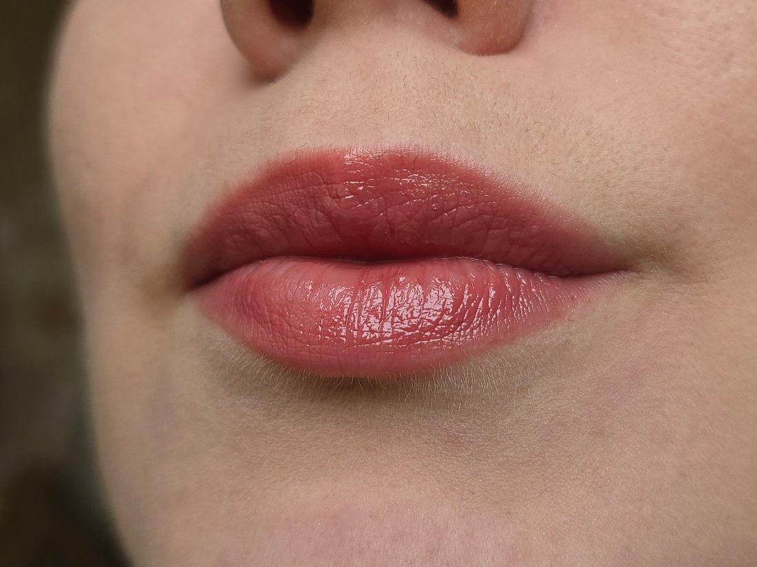 В таком виде помада носится вообще ДОЛГО, даже более-менее впитавшись, она остаётся таким тонким слоем, который уже не блестит, но ещё обозначает губы, без ощущения «о, помада съелась, а контур остался».