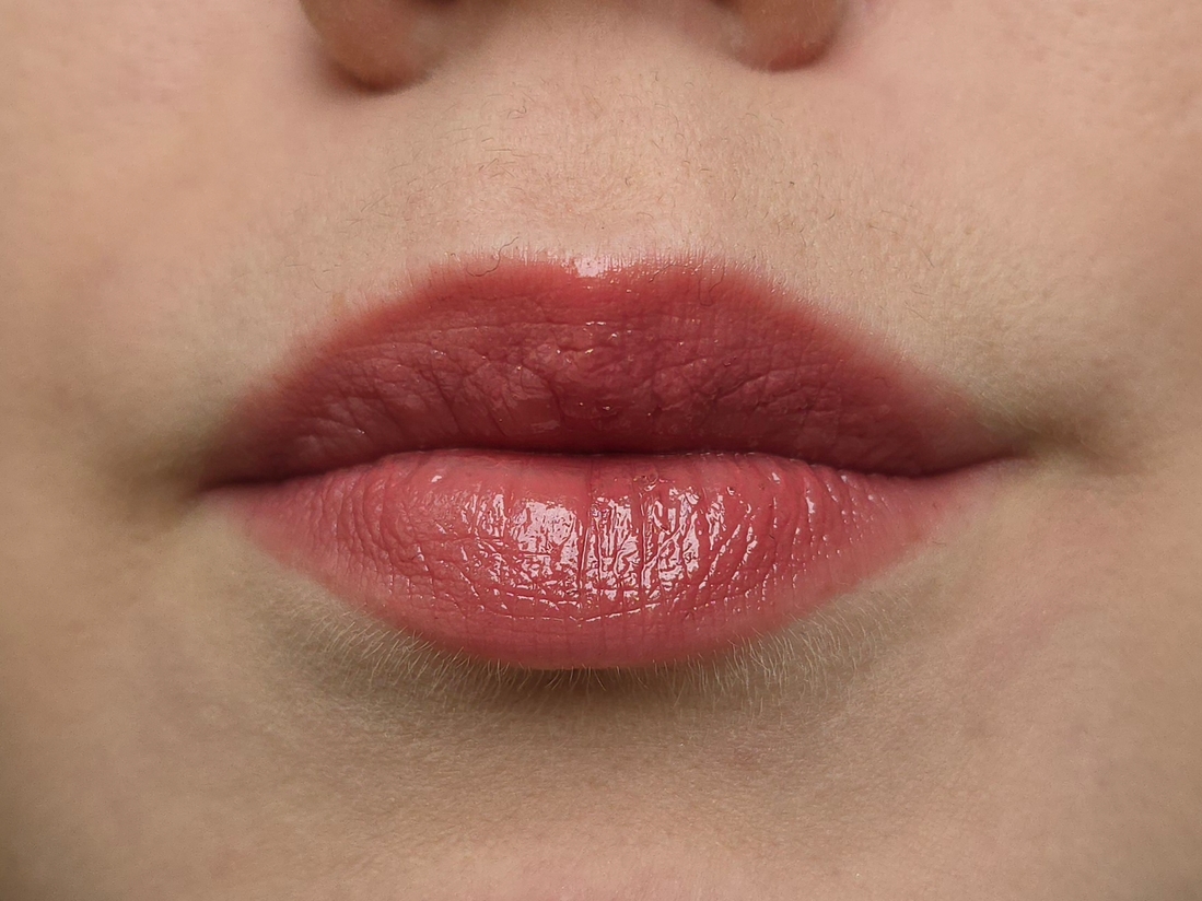 Кажется, что лежит немного неровно, но это скорее из-за того, что я нанесла буквально один слой, из-под которого просвечивают мои довольно яркие губы. Ну и глянец добавляет шороху.