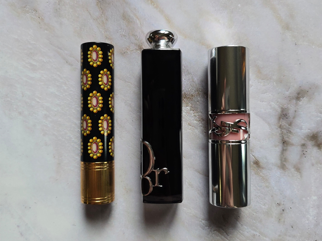 Gucci 214 Call it a day — Dior 521 Diorelita — YSL Loveshine 44 Nude lavalliere.