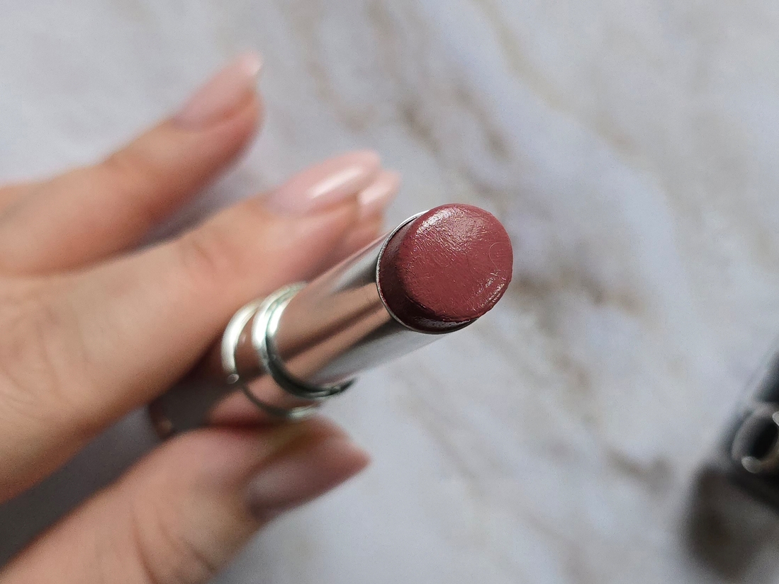 521 Diorelita — розовая с коричневинкой помада, нейтральная по подтону. В стике выглядит более коричневой и тёмной, чем нанесенная на губы.