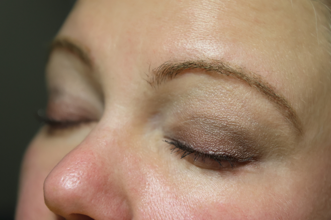 Пять оттенков в натуральных тонах и коричневая подводка. Сейчас она сухая и я не могу вспомнить за давностью лет, была ли она кремовой изначально. По виду, так была. Но я ею как-то никогда особо не пользовалась. Тиснение на пяти других, кстати, держится довольно долго. Светлый наношу на все веко, самый темный в складку, четвертый оттенок с сиянием (или третий, он тоже с небольшим включением шиммера) на подвижное веко, второй ближе к внутреннему уголку, третьим растушевываю края. Тени довольно сухие и ложатся полупрозрачно. На базе лучше и ярче, но для фото без базы. И держится на жирных веках без базы это часа четыре-пять, потом потихоньку поглощается, только самые темные оттенки сохраняются. Я не особо умелец филигранной работы с тенями, поэтому бомбических макияжей никогда не сделаю. Так, что-то ваяю, что попроще и побыстрее. Чаще всего это что-то очень и очень простое в 1-2 цвета. Здесь ниже вот именно так — пятью оттенками.