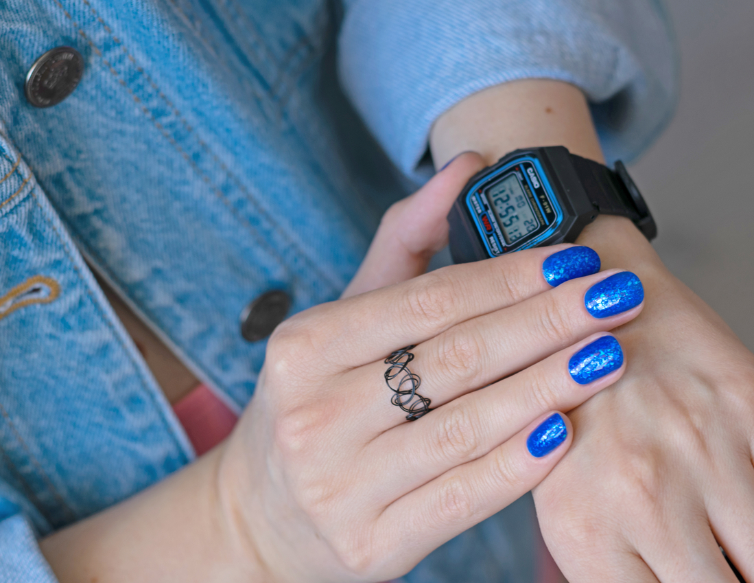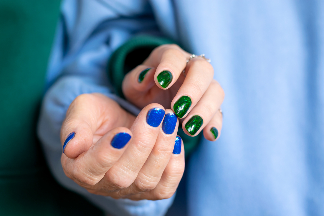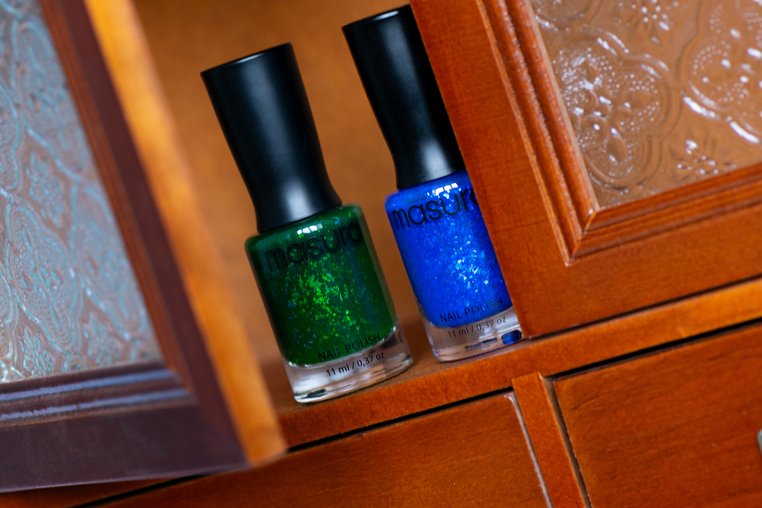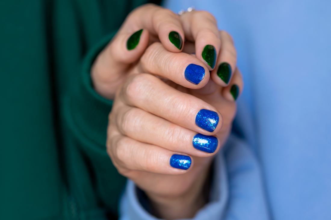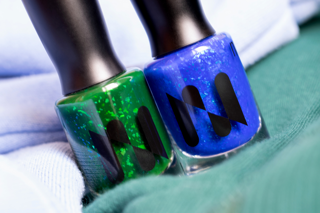 Как вы уже знаете, я большой лакоманьяк, а вот моя мама никогда не любила красить ногти, потому что ей не нравится ощущение лака, говорит, «ногти не дышат») Но технологии не стоят на месте, лаковые покрытия становятся не только все более интересными по наполнению, но и вполне комфортными в носке. И иногда мама просит накрасить ее чем-нибудь «красивеньким». В этот раз я выбрала для нее яркую неоново-синюю «Вареную джинсовку», а для себя – зеленый подарочный «Пусть исполняются мечты», оба со сверкающей слюдой.