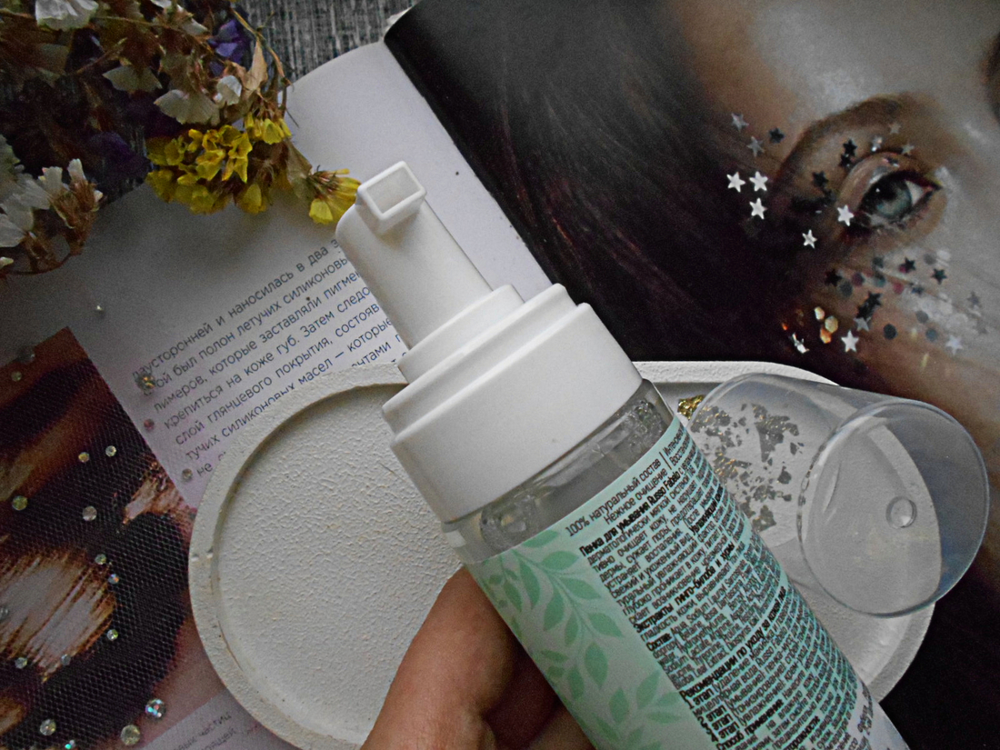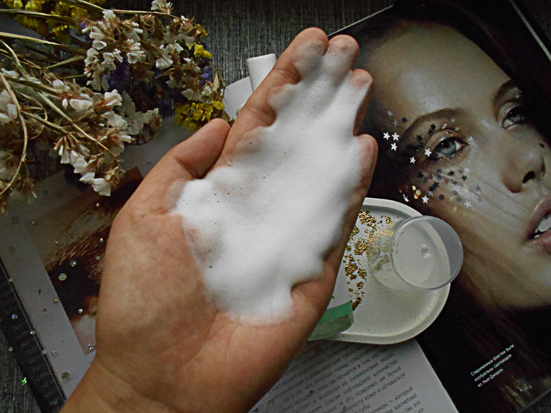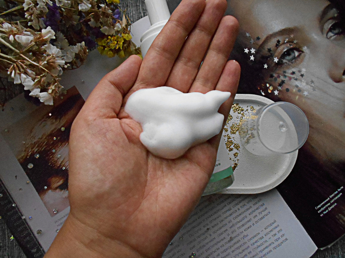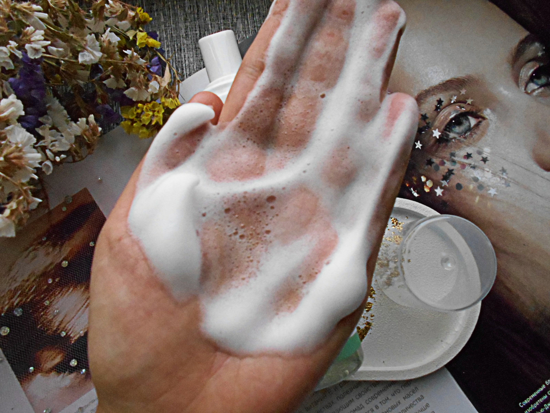 Пенка выглядит как воздушный мусс с минимальным количеством пузырьков. Текстура очень приятная и нежная. Благодаря ей пользоваться пенкой одно удовольствие.