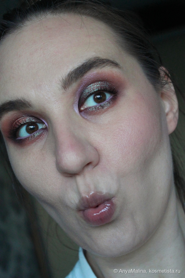 В общем образе тонирование заметно, а насыщенность и глубина цвета реально под любой макияж. Все очень прозрачно, даже веснушку на верхней губе не прекрывает. Да ещё гляньте, чисто жидким стеклом залила. Люблю такой эффект, да ещё и без лишней липкости.