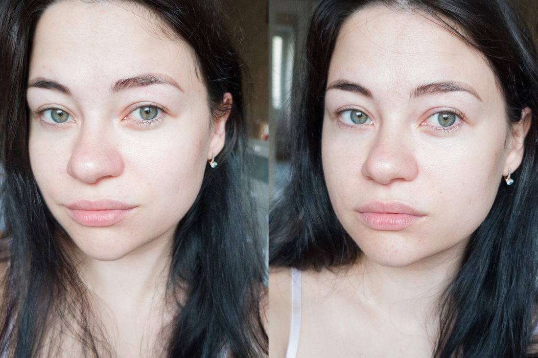 Тонер слегка увлажняет кожу, освежает её, и как я уже сказала, создаёт легкий охлаждающий эффект. А что там с отёками? На снимке слева мое лицо до, так сказать только с кровати, а справа через 10 минут после нанесения тонера. Разница есть, но не колоссальная. Причём на фотографии она заметна больше, чем в зеркале. Немного ушла припухлость с век, взгляд стал более открытым и как будто носогубная складка куда-то пропала. То ли она появилась из-за отёка, то ли я просто так неудачно сомкнула челюсти.