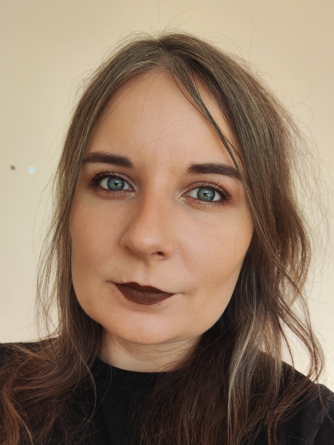 Глубокий темно-бордовый. Я вижу в нем нотки коричневого и сливового, подтон — холодный, винный. Отличный матовый для затемнения внешнего уголка и в мягкую стрелку, но можно и смоки нарисовать — было б желание.