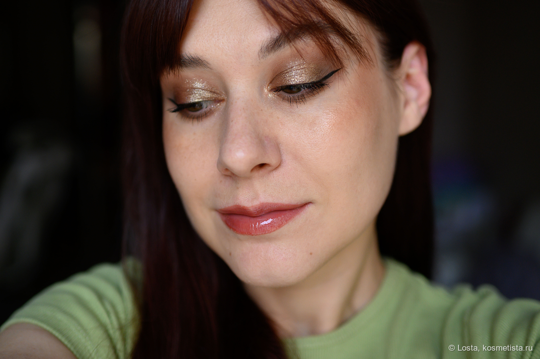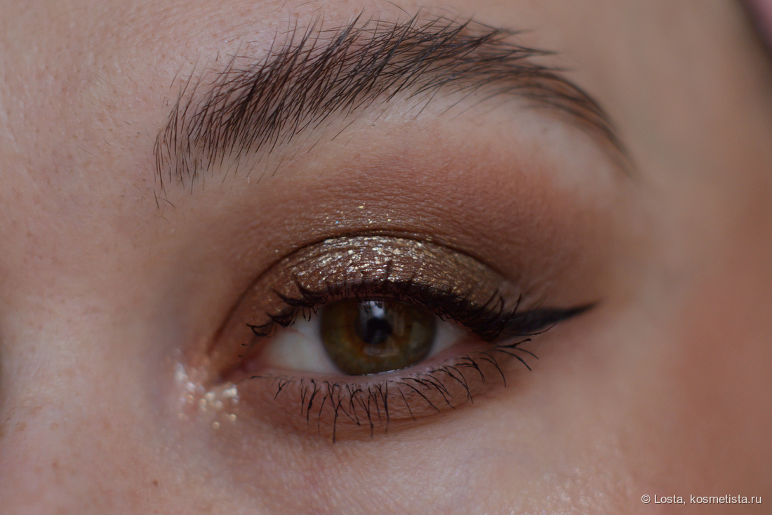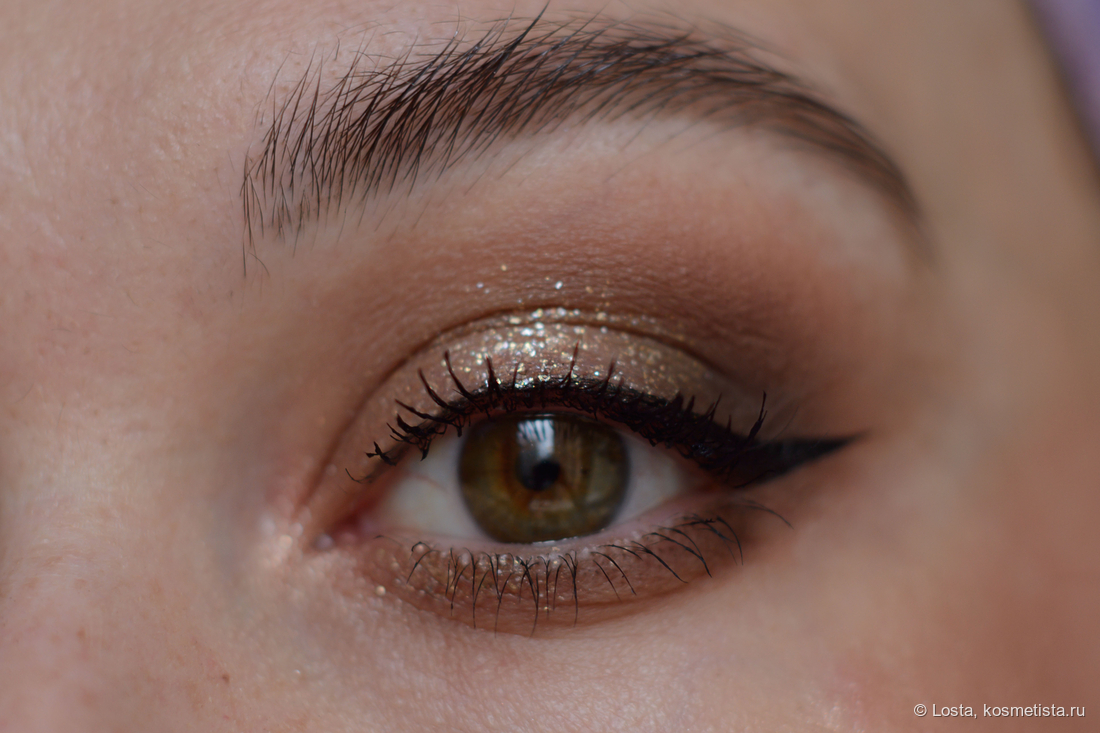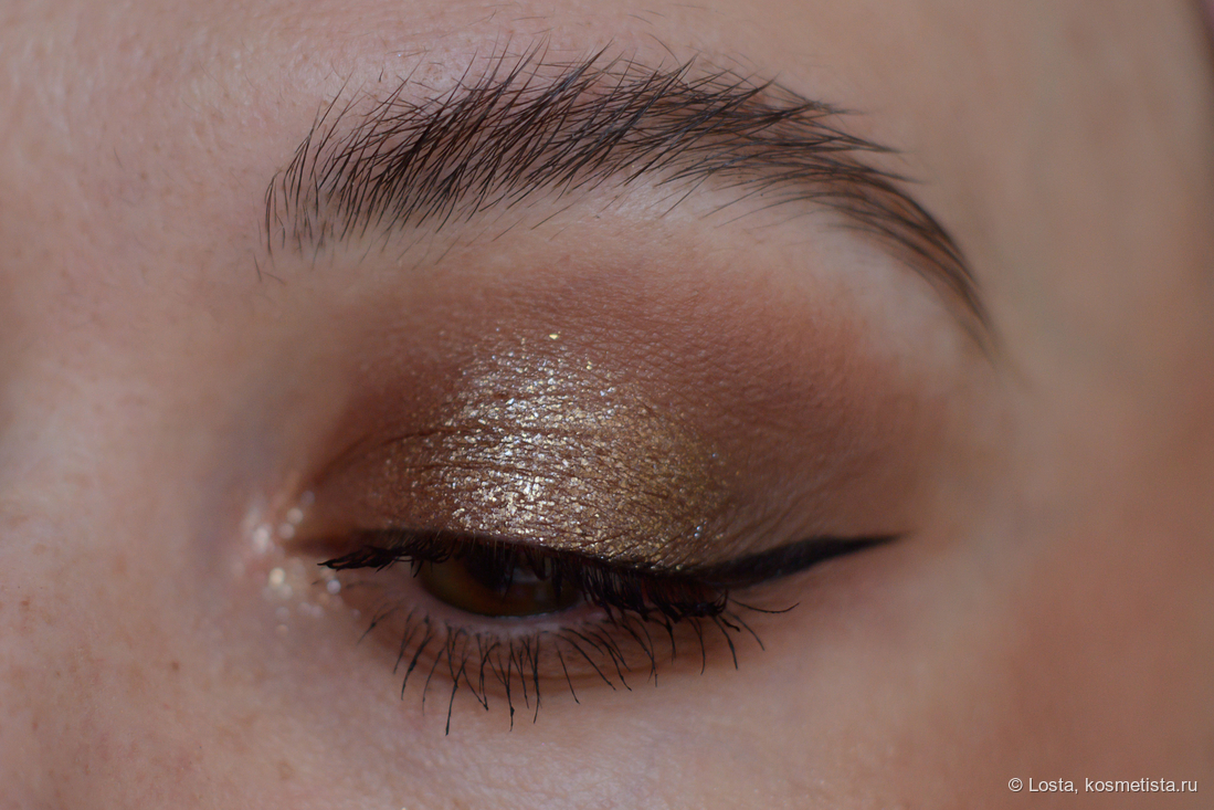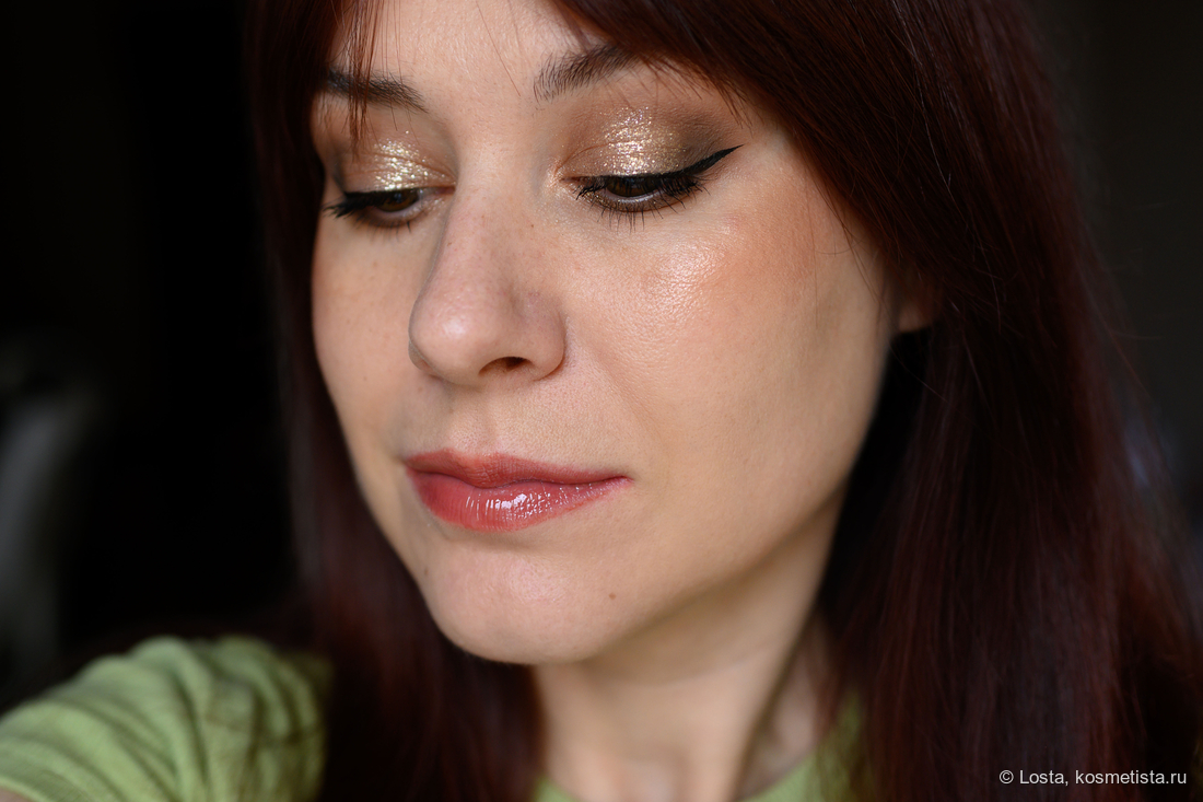 Оттенок #2 — спарклообразный оттенок шампанского с золотистым отливом. Он очень красивый, но тяжело набирается, только пальцами, можно, конечно, набрать на кисть и распределить, когда во внутренний уголок наносишь, но растягивать не прямо легко. В целом — немного скатывается на веке часов через 10, но еле заметно.