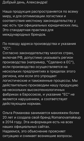 Зашла на её сайты .com и .ae. Так интересно) На.соm написано, что она создала свой бренд в 2014 и занимается макияжем более 20 лет, а на .ae, что Established over two decades ago, Romanovamakeup was conceptualised by Olga Romanova😏