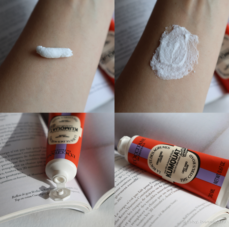Белоснежный крем, текстура — суфле. Быстро распределяется и так же быстро полностью поглощается. Пахнет ярким сочным цитрусом (фрукты, мандарин, апельсин, кумкват); отдушка чувствуется только в момент нанесения.