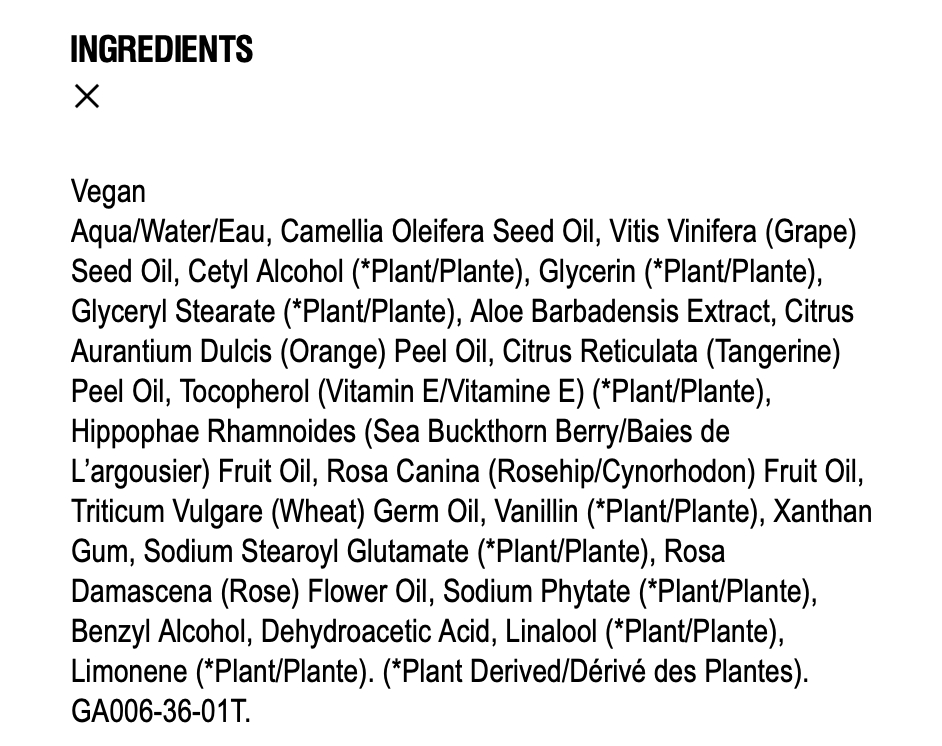 Основные компоненты: масло виноградных косточек, апельсиновой кожуры холодного отжима, зародышей пшеницы, камелии и шиповника, Омега 3 и 6, алоэ вера, витамин Е.
