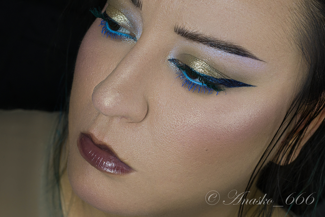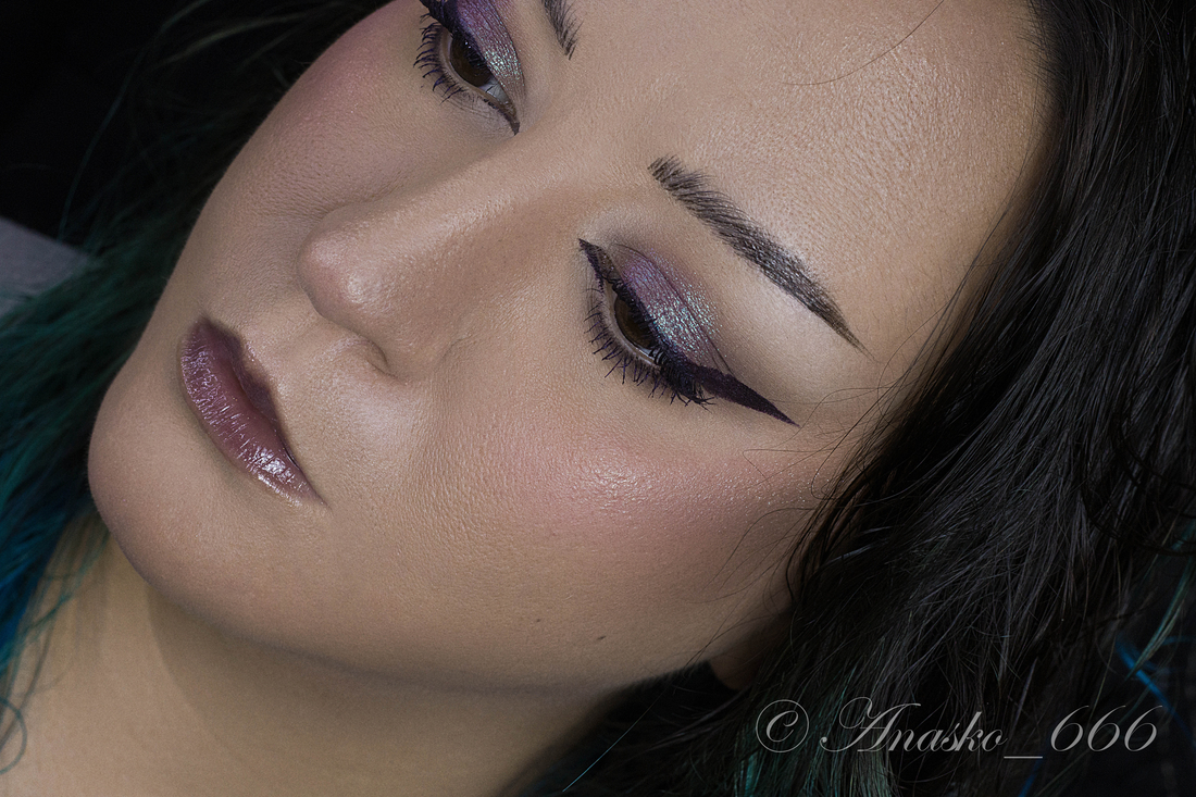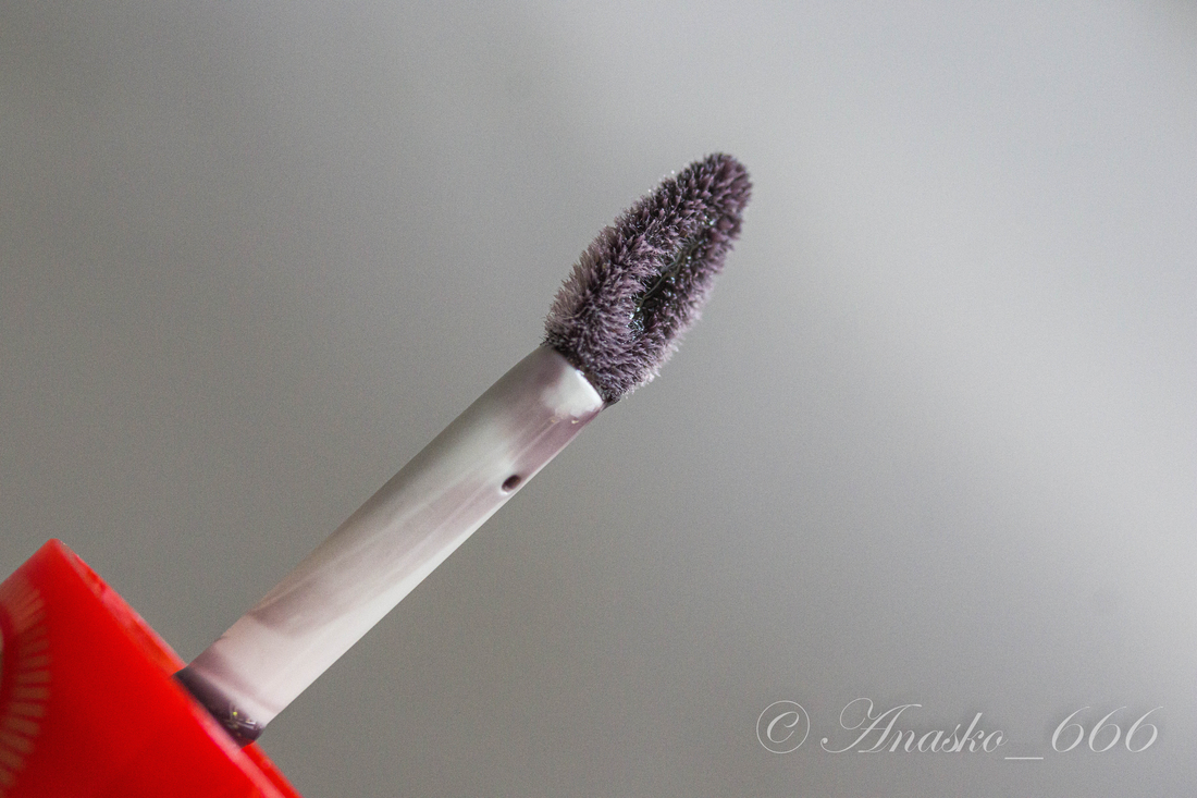 На свотче блеск многообещающе прекрасен: чернично-томно-серый с вкраплением золотистых блесточек. Блесточек, к счастью, мало и в макияже они не видны, заметны лищь на фото. И это, на мой вкус, плюс, так как они мне не особо понравились в данном сочетании с оттенком.
