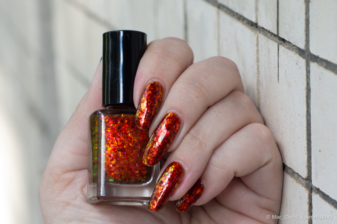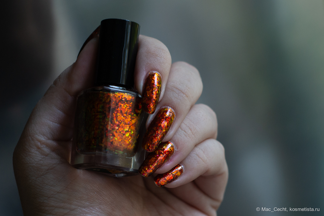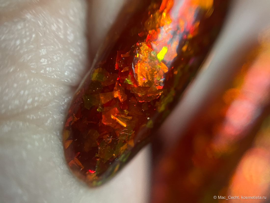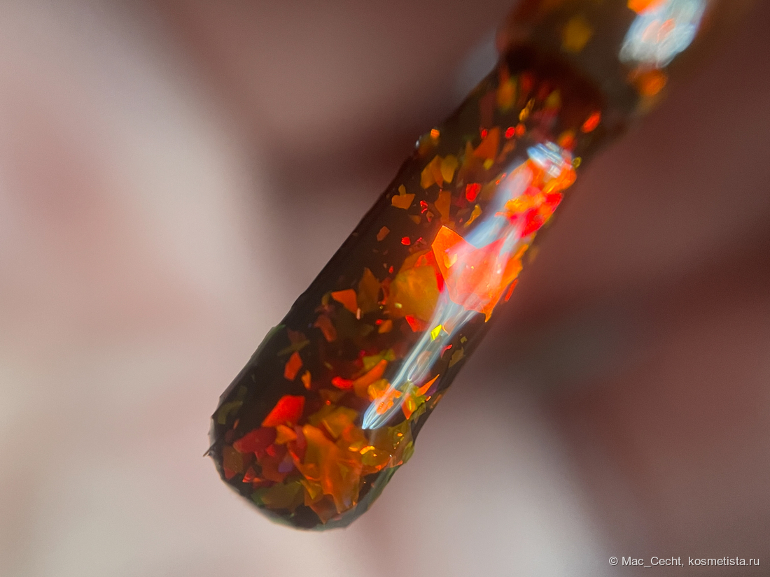 Давайте смотреть! Чаще всего лак с достаточно яркой слюдой, но больше рыжий, чем оранжевый.