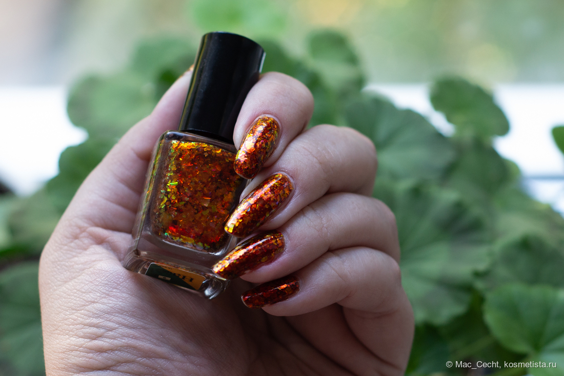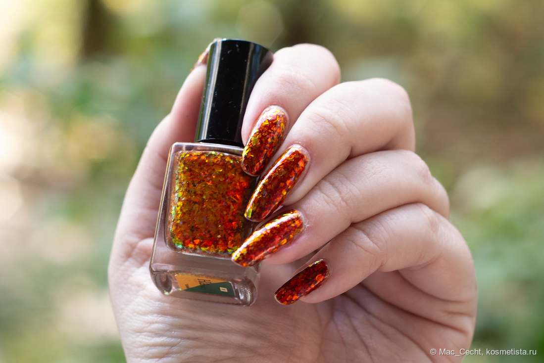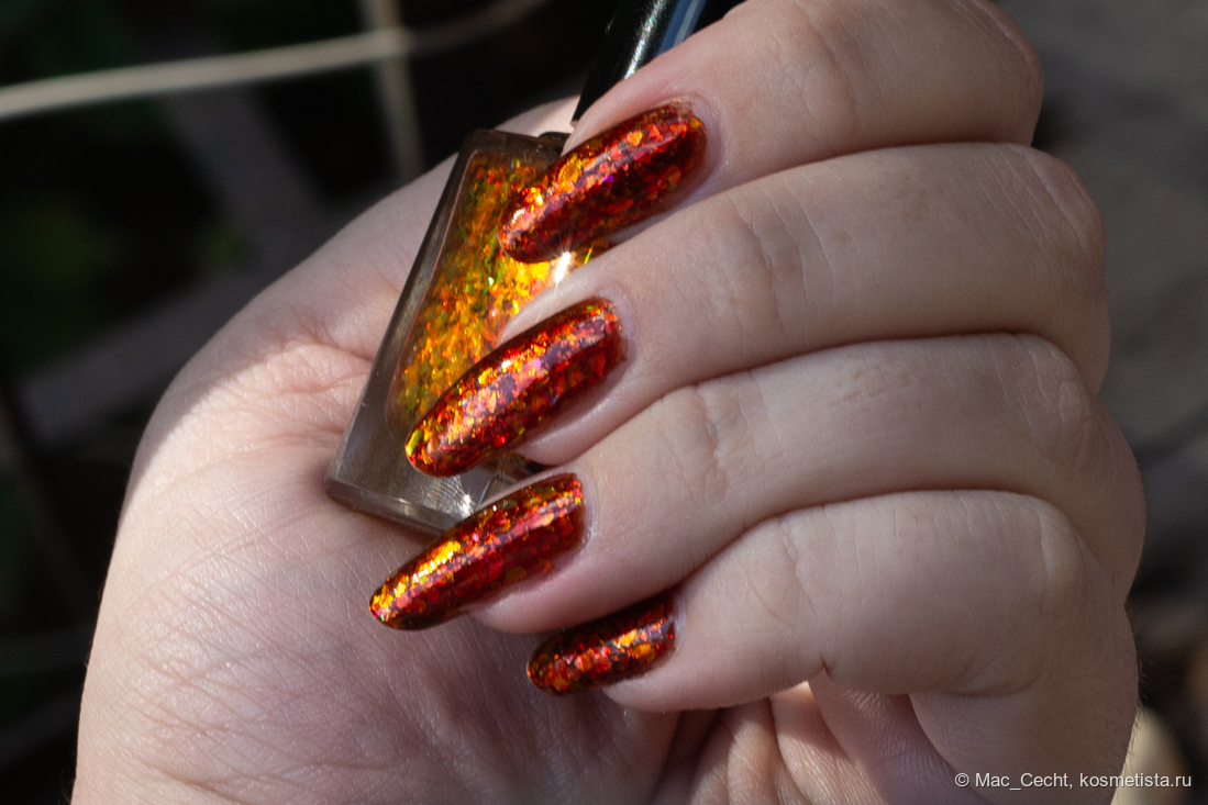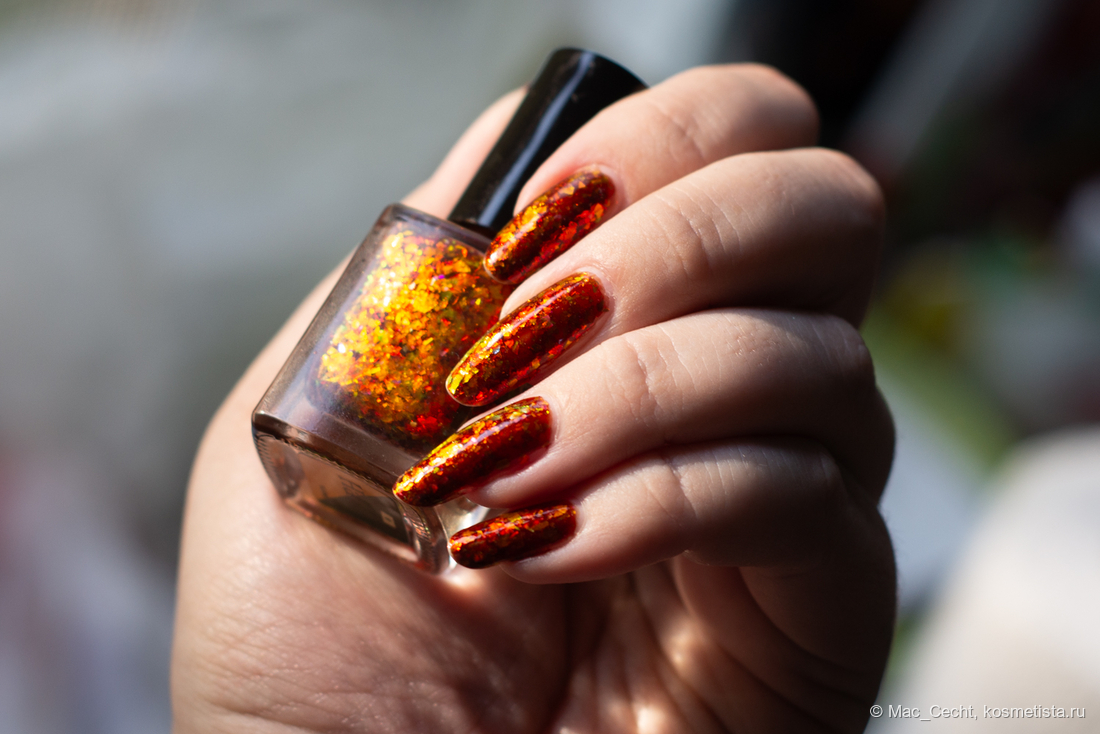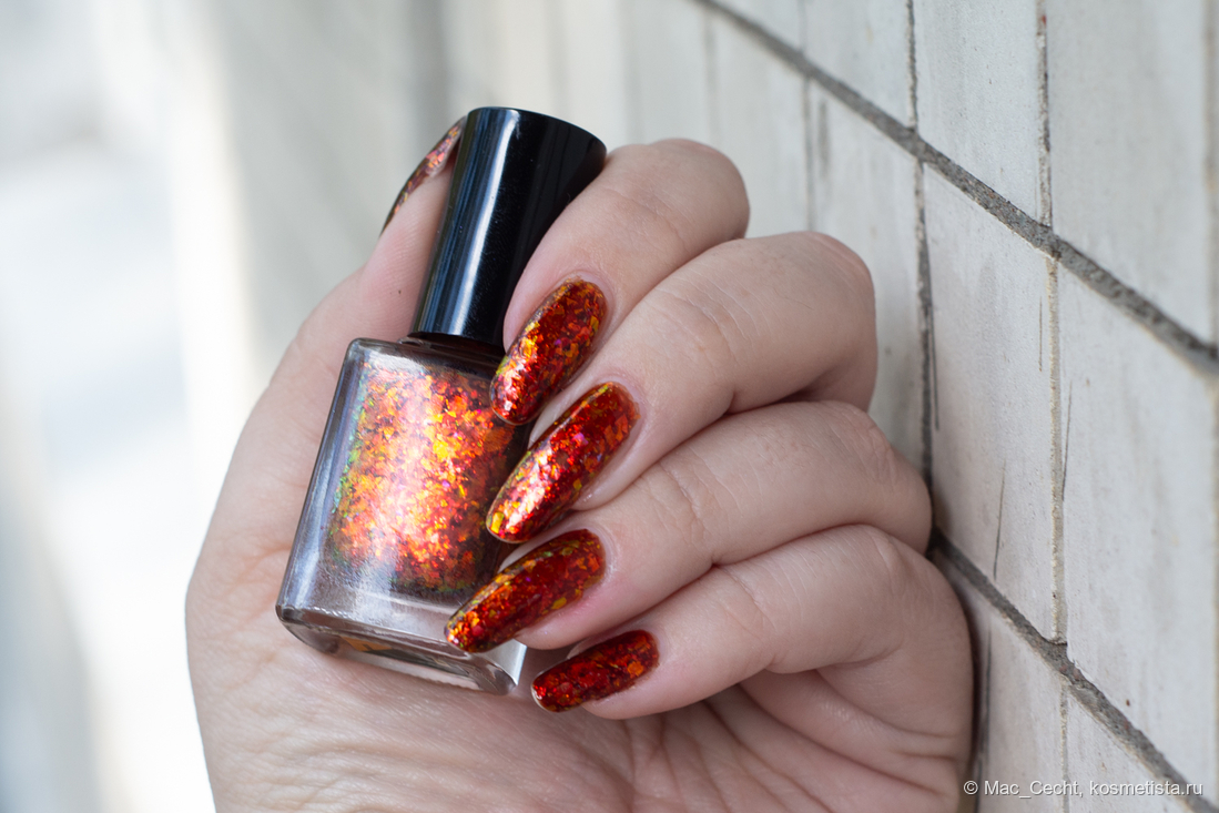 Давайте смотреть! Чаще всего лак с достаточно яркой слюдой, но больше рыжий, чем оранжевый.