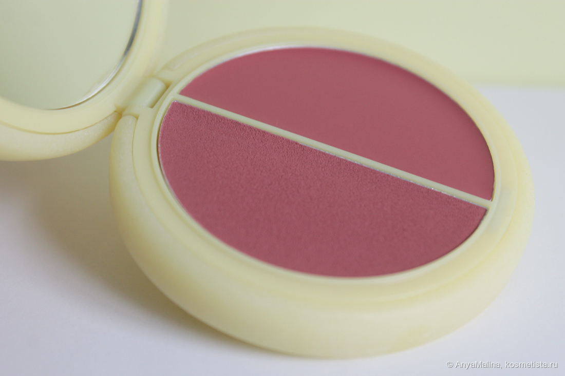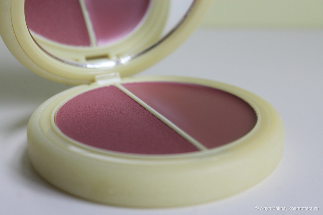 Если вы где-то уже видели эти тяжёленькие шайбы из матового пластика с магнитами, то описанием формфактора я вас не впечатлю. Двойные румяна в матовой и сияющей формуле разделены в кейсе, есть зеркало, которое магнит притягивает к низу футляра. Собственно магнит и хрупкость упаковки — единственное, что может смутить при покупке. Но у меня это третьи румяна и крышка ещё ни у одних не отдетела. Не буду дуть на воду.