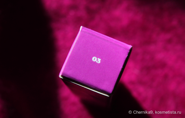 Тушь продаётся в картонной коробочке. На ней крупно написано название бренда и продукта. Картон довольно плотный, красивого фиолетового цвета. Мне такой стиль очень нравится: в нём есть и минимализм, и эстетика. Сверху написан оттенок 03.