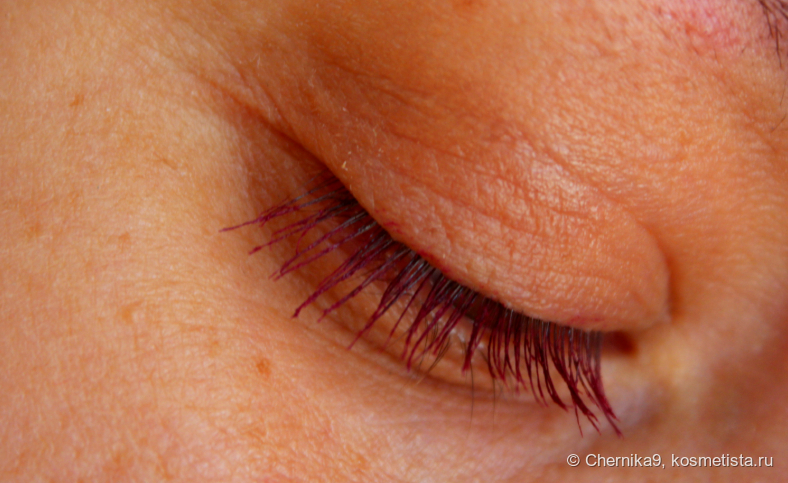 Оттенок на фото значительно отличается от того, какой получается на ресницах (но об этом чуть позже). Он ближе к малиновому, а не к сине-фиолетовому.