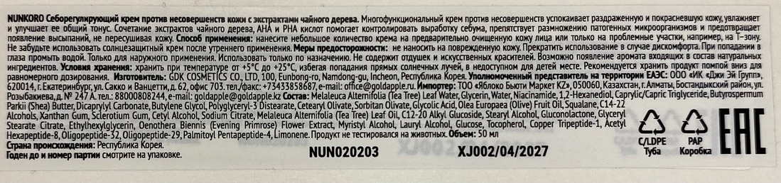 Себорегулирующий крем против несовершенств кожи NUNKORO Trouble relief treatment