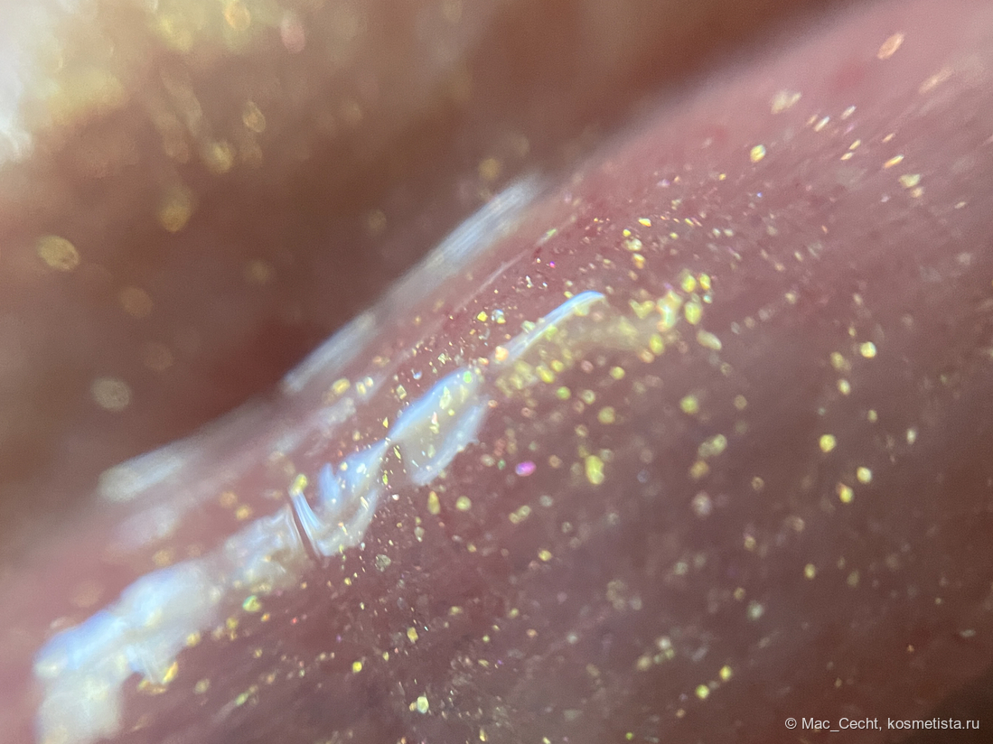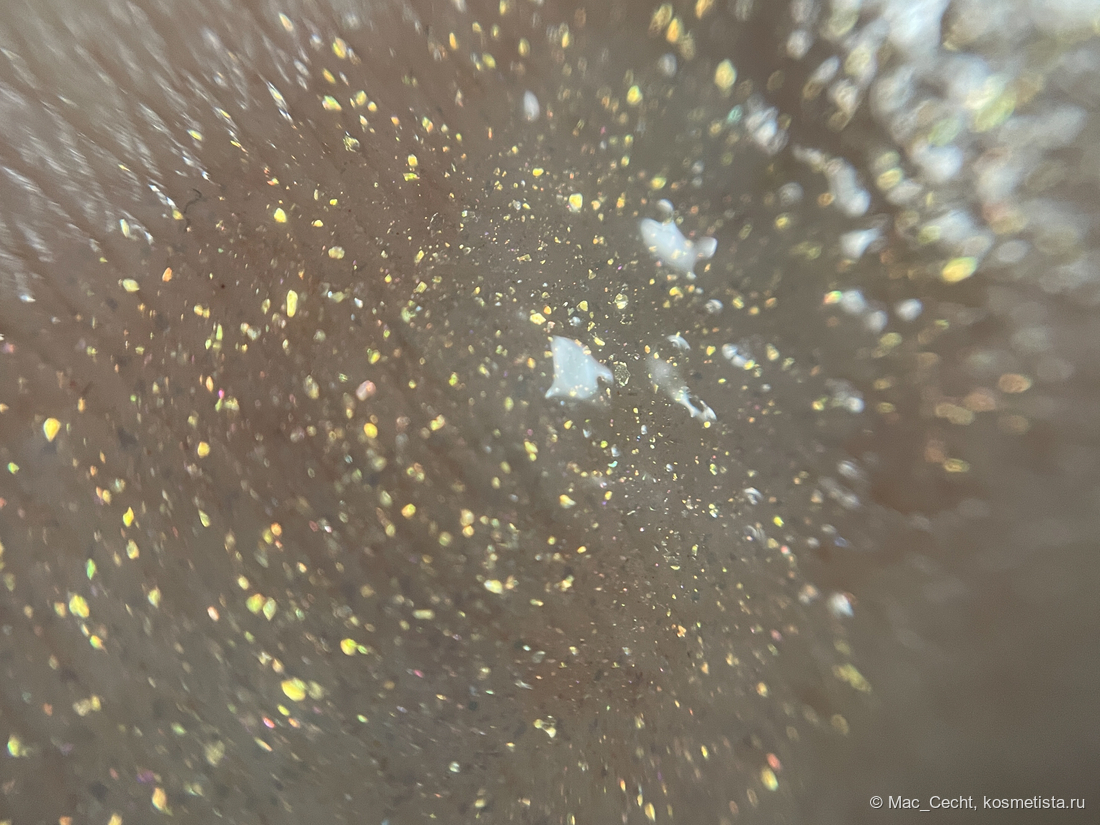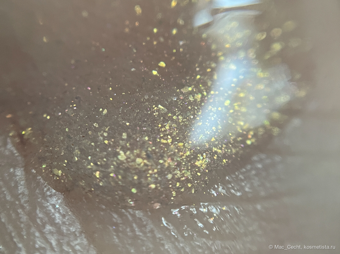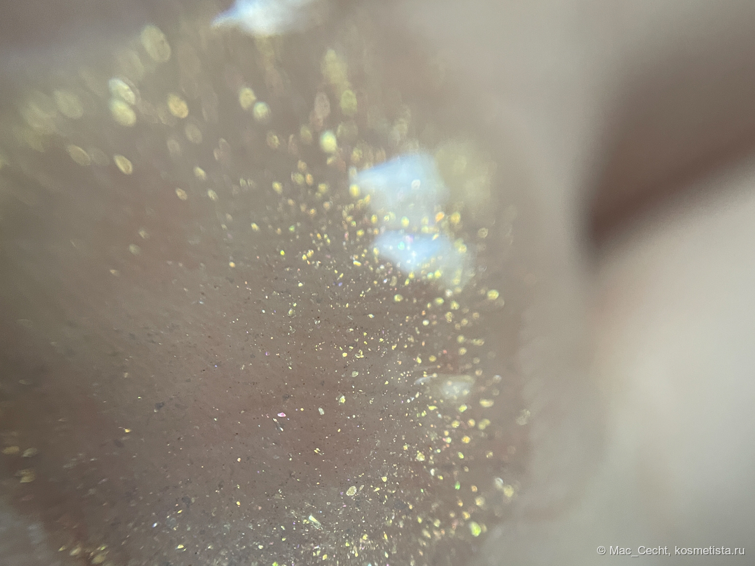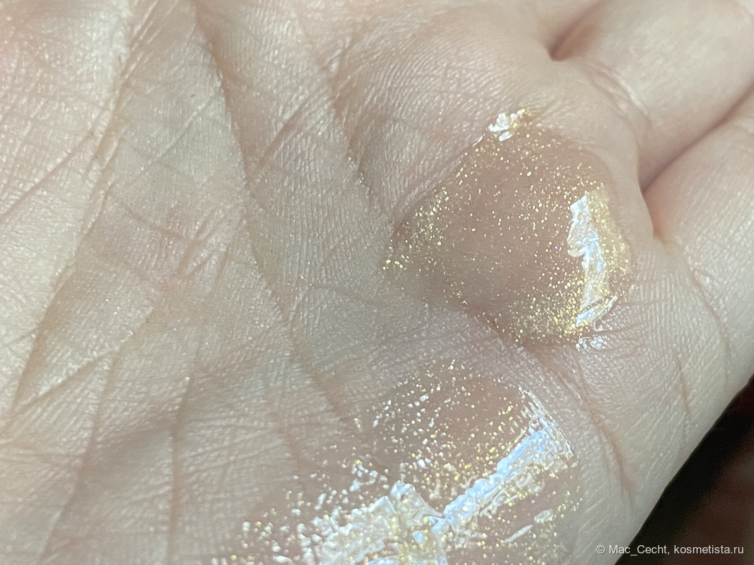Это масло с золотым шиммером и мельчайшей серебристой слюдой. Ее толком и не видно, но кое-где можно заметить некий эффект выбеливания от нее.