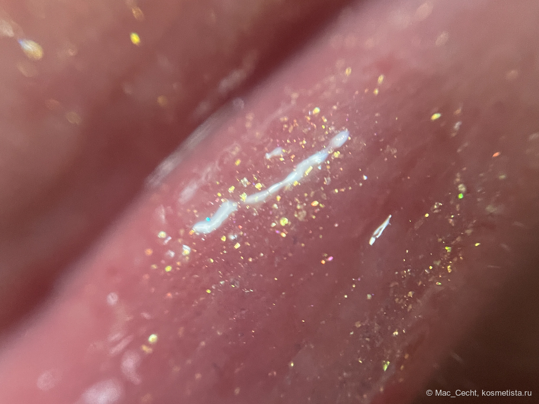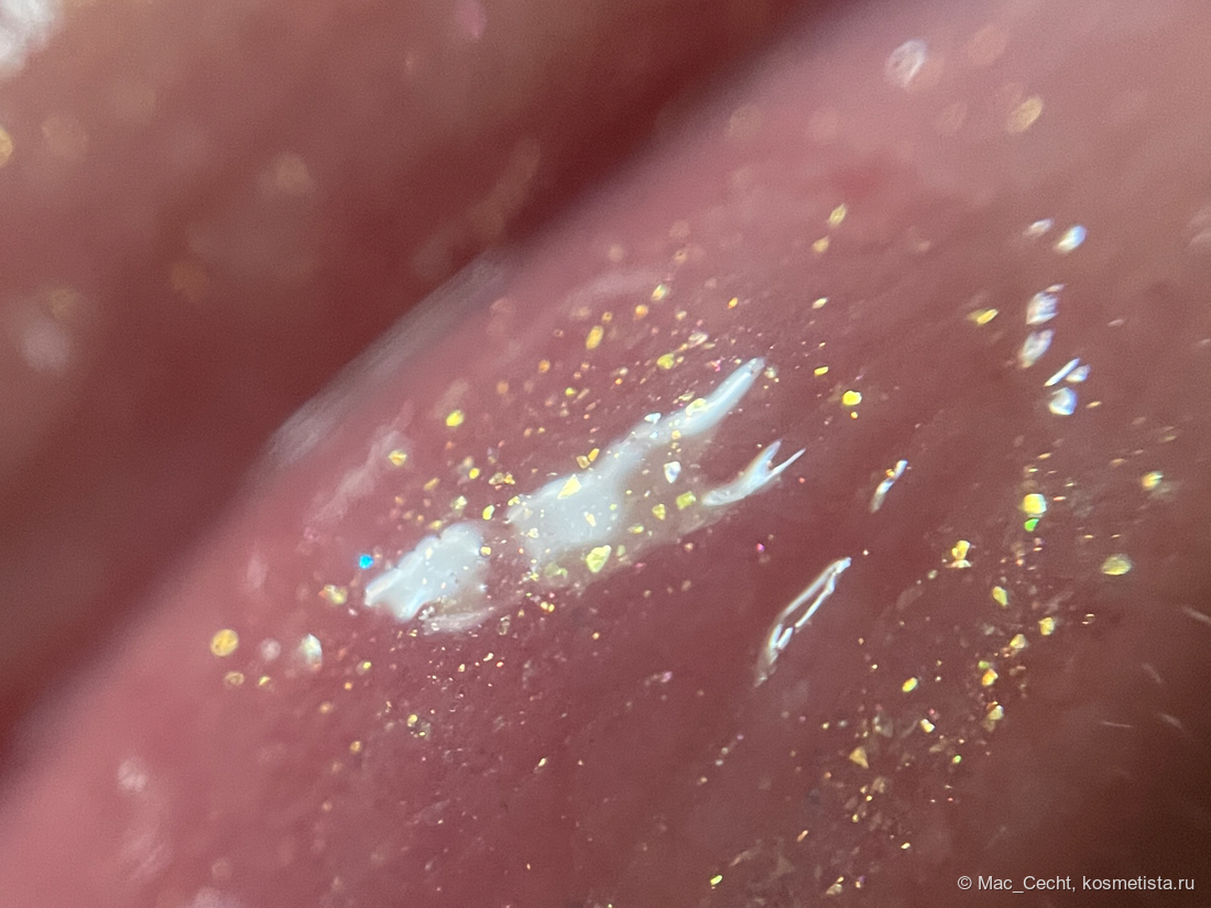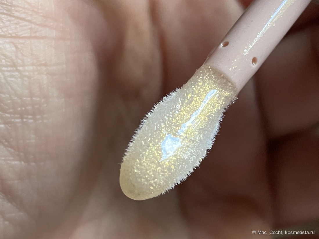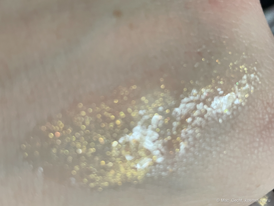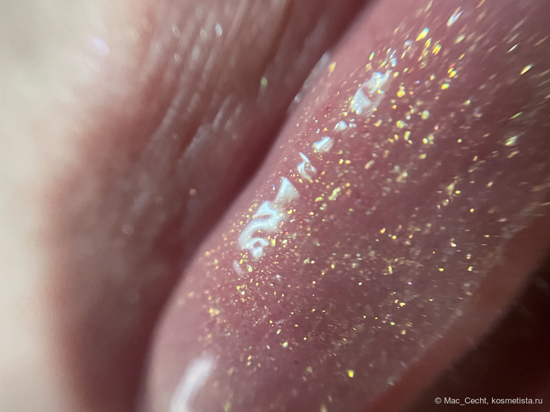 Это масло с золотым шиммером и мельчайшей серебристой слюдой. Ее толком и не видно, но кое-где можно заметить некий эффект выбеливания от нее.