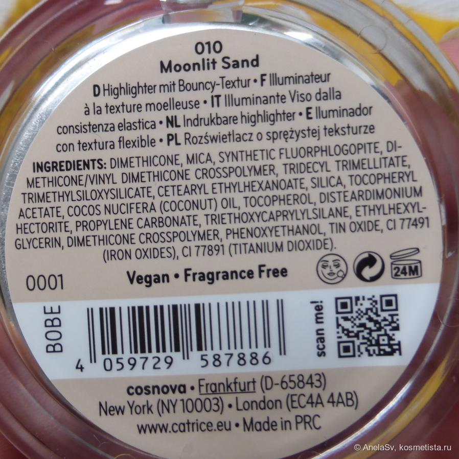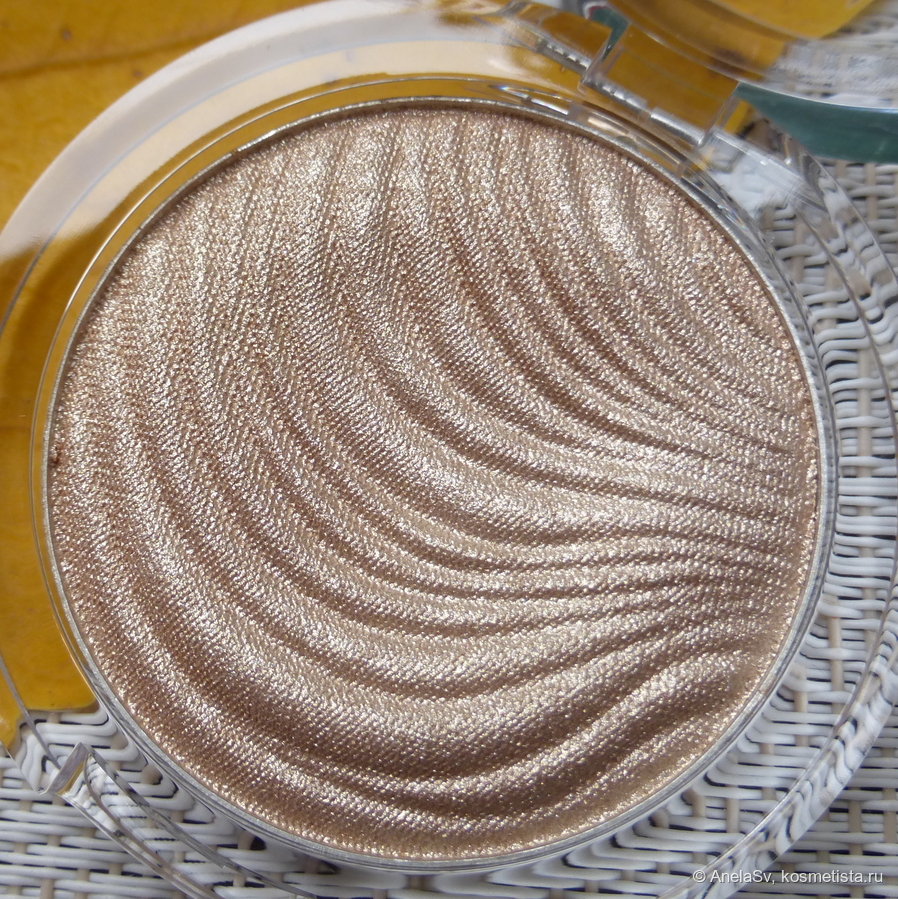 Запеченный хайлайтер, который можно жмякать как хочешь — у него очень мягкая консистенция, напоминающая тесто для лепки. Пластик очень прочный, крышка как будто двойная, вес продукта 6,4 г, сделан в Китае. Написано, что без отдушек, но я чувствую легкий аромат кокоса.