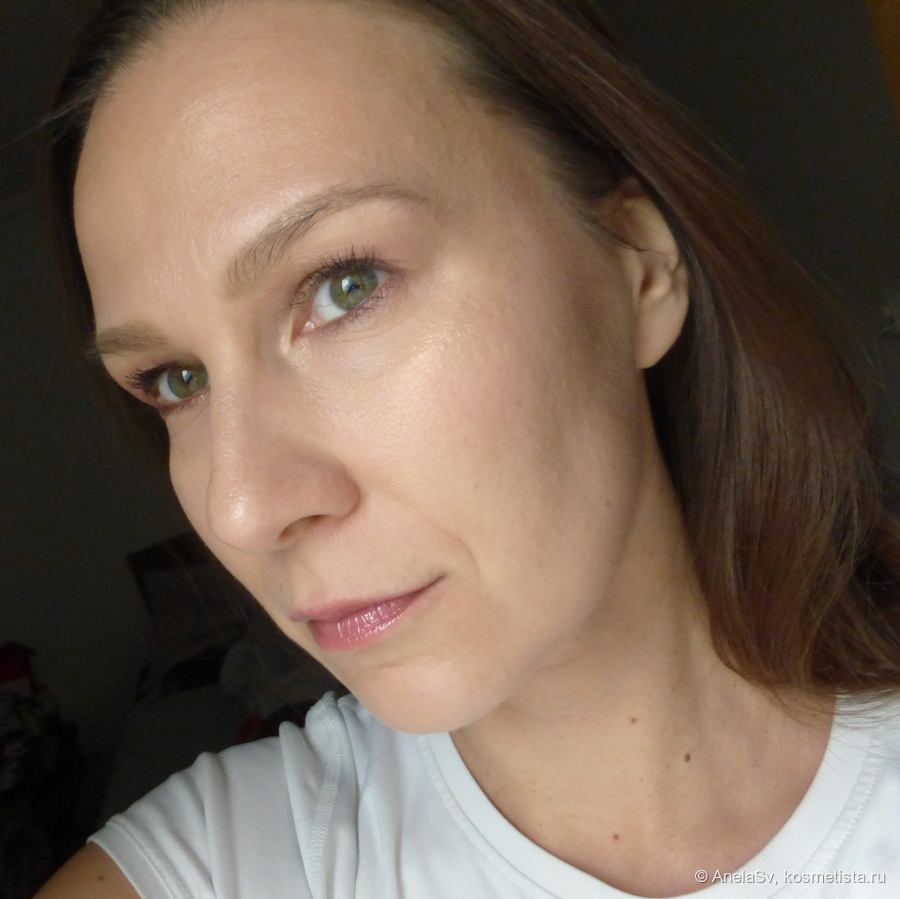 Набирается очень хорошо — плотный цвет выглядит как единое полотно, переносится тоже без проблем. Не имеет серой полосы, не дает рефлекса. Выглядит классно и подходит под любой макияж. Я наношу пальцами — кисть надо подобрать плотную, веерной не нанесете. Стойкость — 6-7 часов, потом тускнеет.