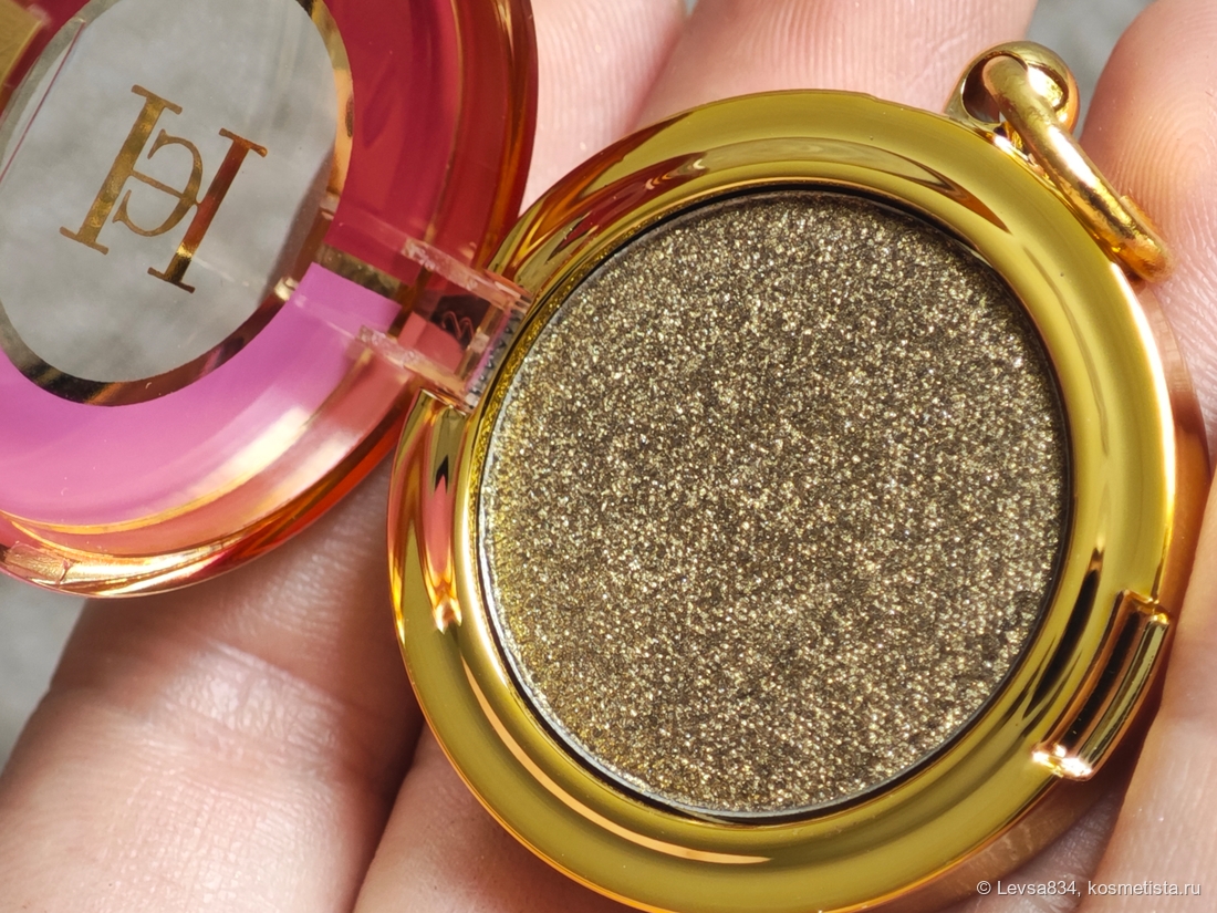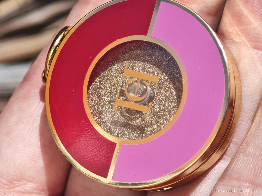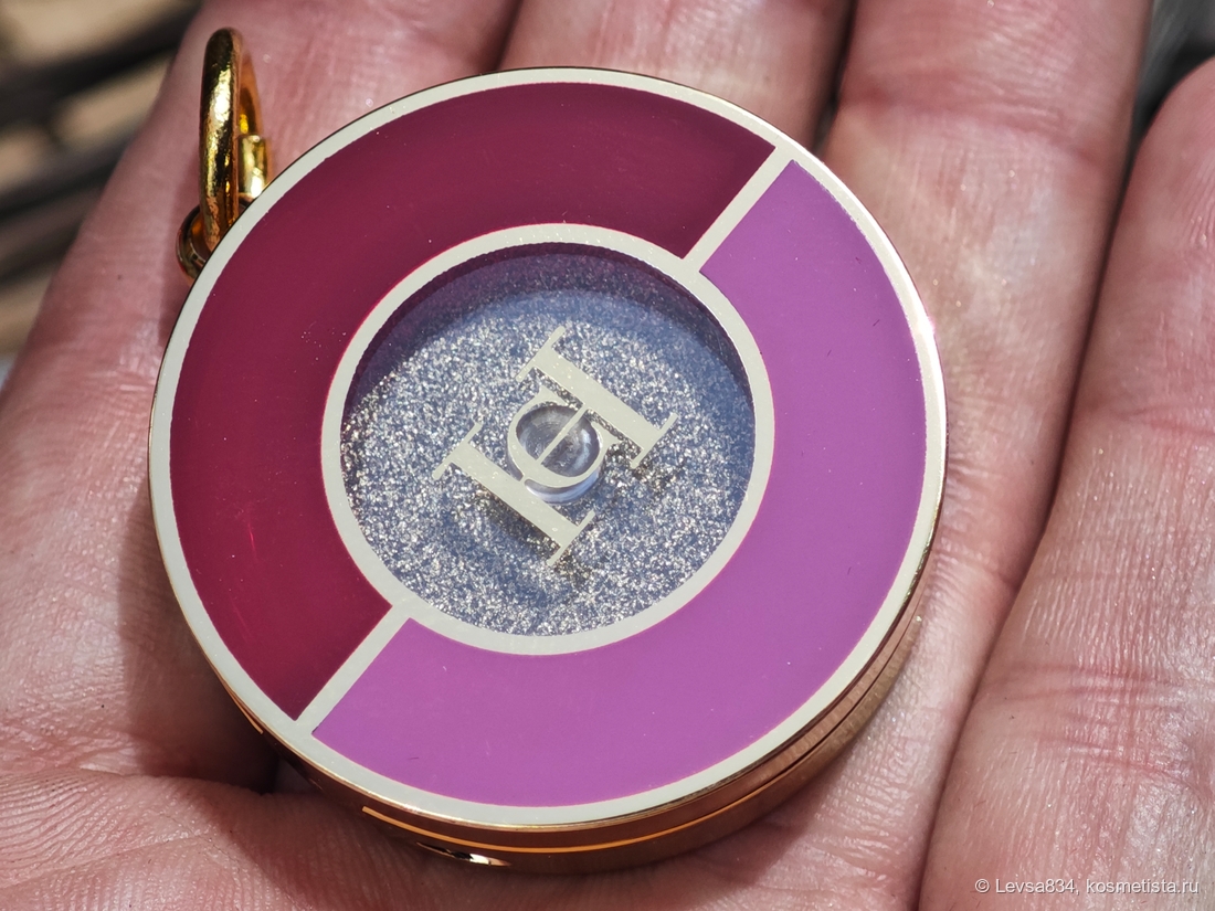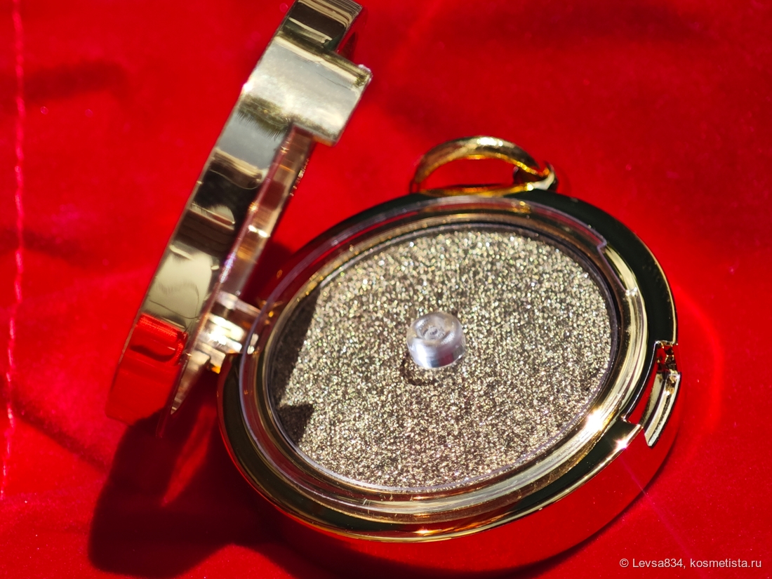 Палетка очень качественно сделана, это огромное круглое золотое ложе из прочного гладкого пластика. Защитный кружок, закрывающий рефил имеется. Крышка с цветными полосками, обозначающими финиш продукта, с прозрачным окошком в центре, очень удобно, оттенок сразу виден. Зеркала нет, зато есть кольцо для крепления к кольцу уже большего диаметра, предназначенному для удержания подвесок. У косметики Эррреры есть секрет, ей можно как конструктором играть, соединяя разные детали и получая наборы из теней, помад, блесков и многочисленных брелочков, что весьма занятно. Возможно, я и наберу себе целую горсть оных в будущем, но хотелось бы сначала посмотреть на них глазами, в таких мелочах я тоже мелочная и деталистка, надо, чтобы и руки любили, и глаза жаловали.