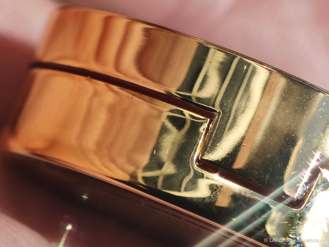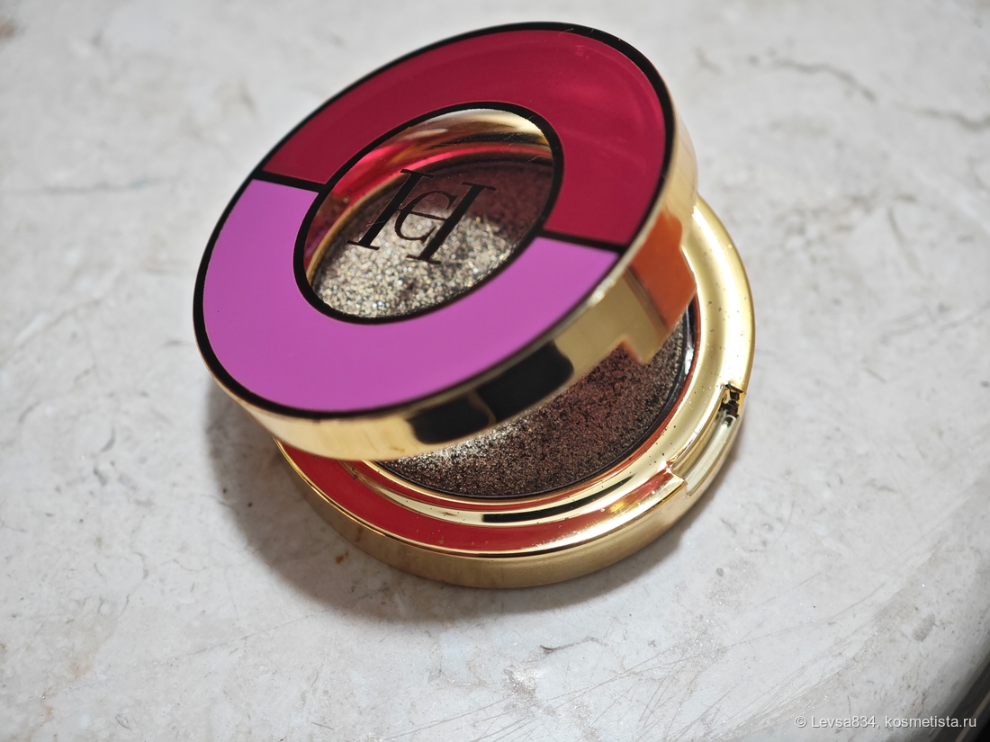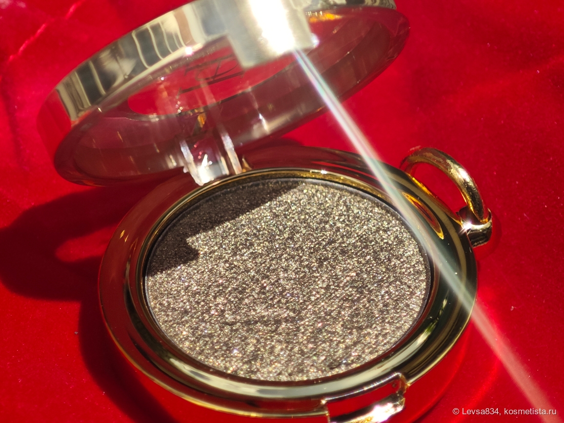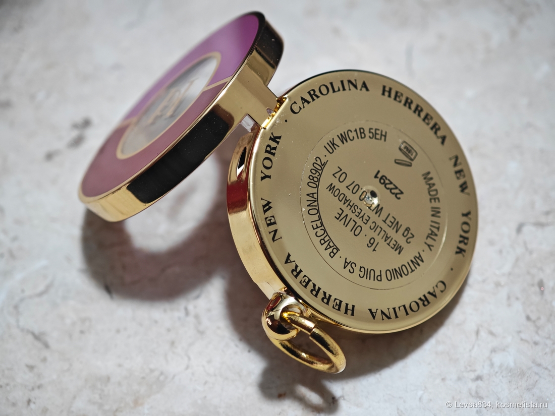 Палетка очень качественно сделана, это огромное круглое золотое ложе из прочного гладкого пластика. Защитный кружок, закрывающий рефил имеется. Крышка с цветными полосками, обозначающими финиш продукта, с прозрачным окошком в центре, очень удобно, оттенок сразу виден. Зеркала нет, зато есть кольцо для крепления к кольцу уже большего диаметра, предназначенному для удержания подвесок. У косметики Эррреры есть секрет, ей можно как конструктором играть, соединяя разные детали и получая наборы из теней, помад, блесков и многочисленных брелочков, что весьма занятно. Возможно, я и наберу себе целую горсть оных в будущем, но хотелось бы сначала посмотреть на них глазами, в таких мелочах я тоже мелочная и деталистка, надо, чтобы и руки любили, и глаза жаловали.