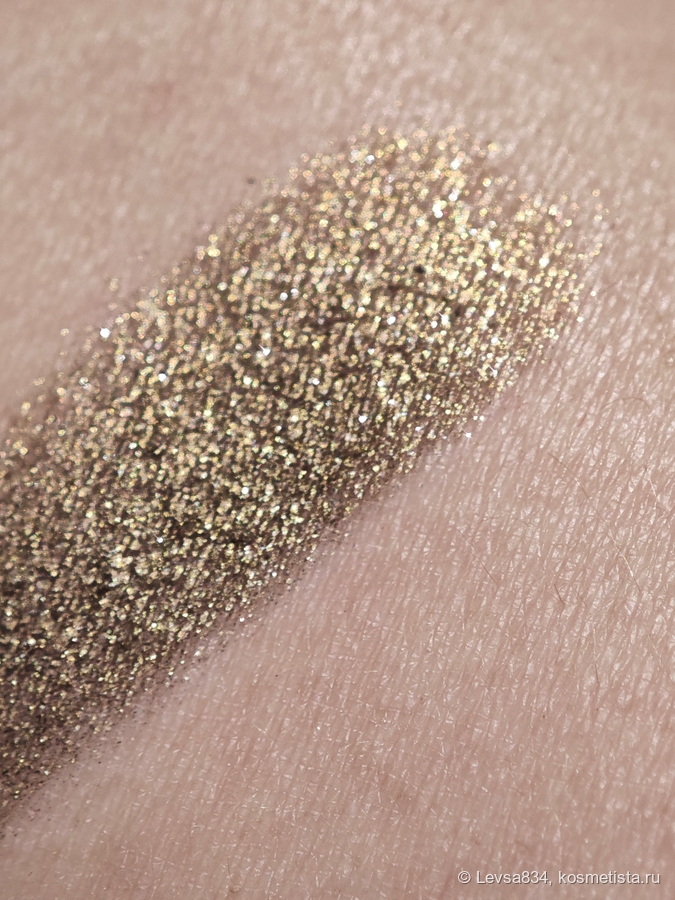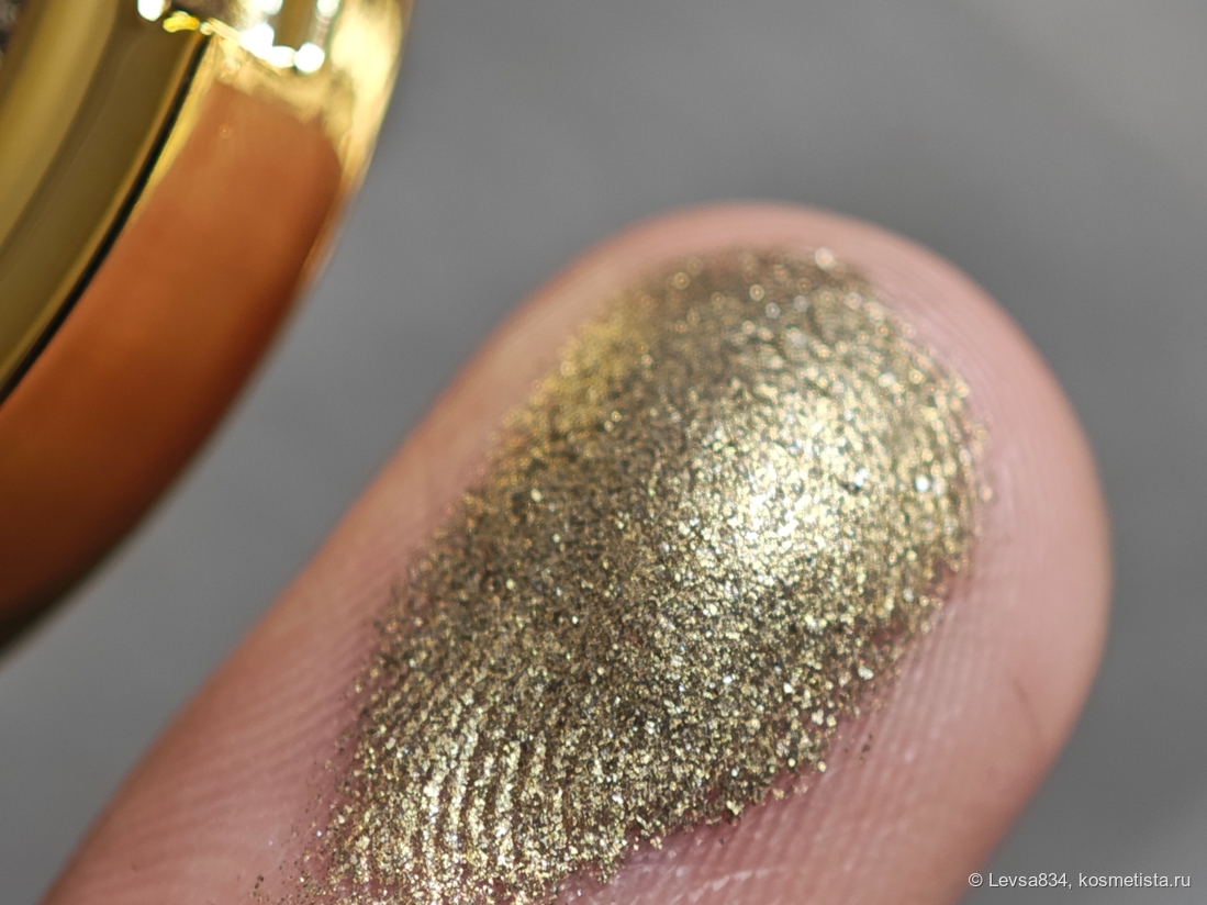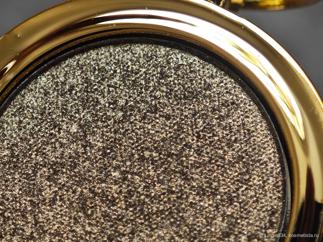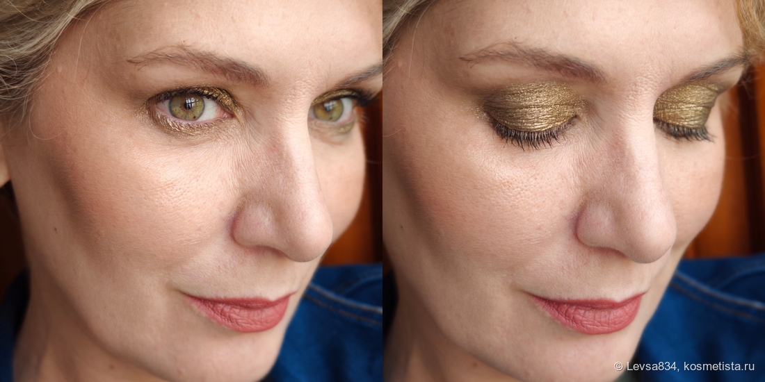 Оттенок соответствует названию полностью, это довольно тёмный болотный оливковковый зелёный, в котором мало жёлтых, но есть серые ноты. Словно состаренное золото. Очень красивый, очень универсальный цвет, который легко можно вписать во многие макияжи. С этим оттенком радужки моих глаз выглядят не такими яркими, как обычно, но мне это нравится. А когда я представляю, как они подсветят карие и голубые глаза, то ахаю, загляденье же.