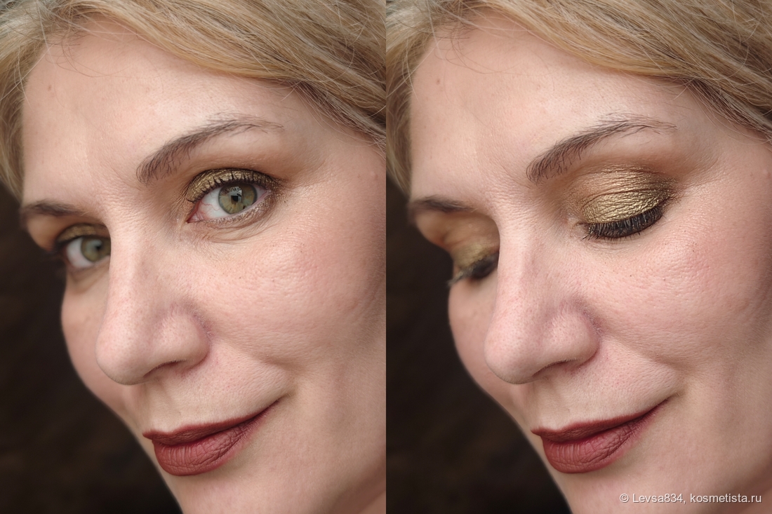 На моих веках к концу дня без базы оливка может немного потускнеть в местах складок, это отличный результат.