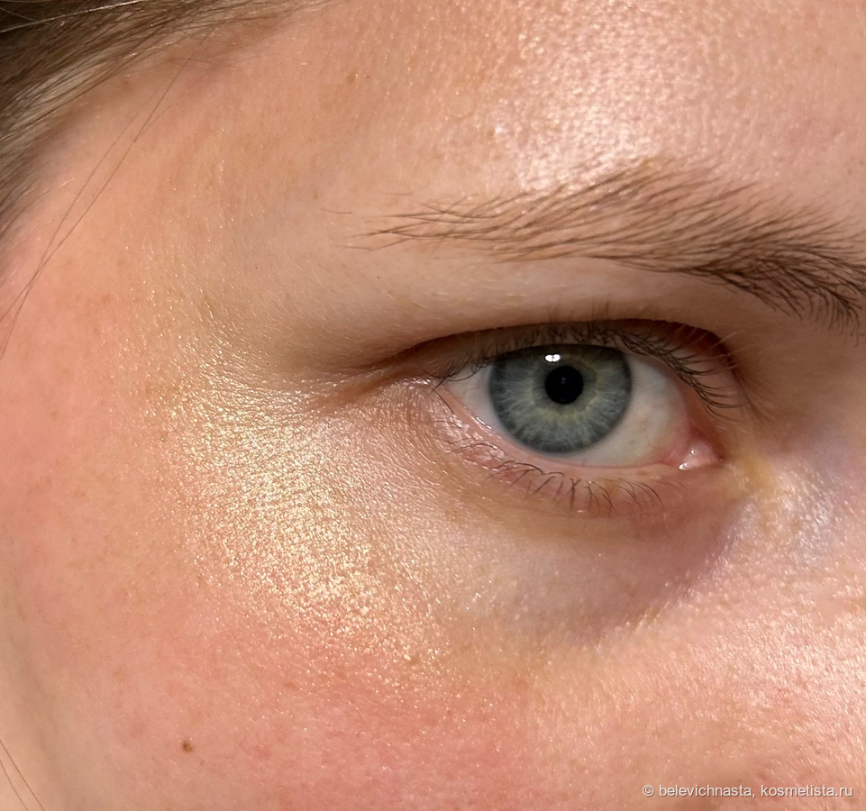Этот хайлайтер еще хорош тем, что не подчеркивает сухость и морщинки. У меня эта область довольно сухая и он, отражая свет, сглаживает гусиные лапки и делает незаметными.