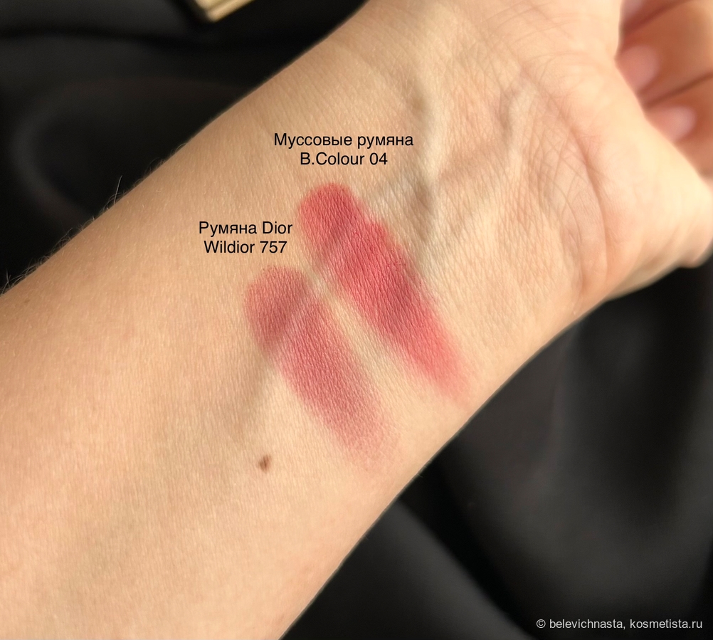 Этот оттенок я сравнила с оттенком 04 Naked муссовых румян B.Colour, которые очень люблю и часто использую. Несмотря на кажущуюся насыщенность румян в палетке Dior, они не намного ярче румян B.Colour.