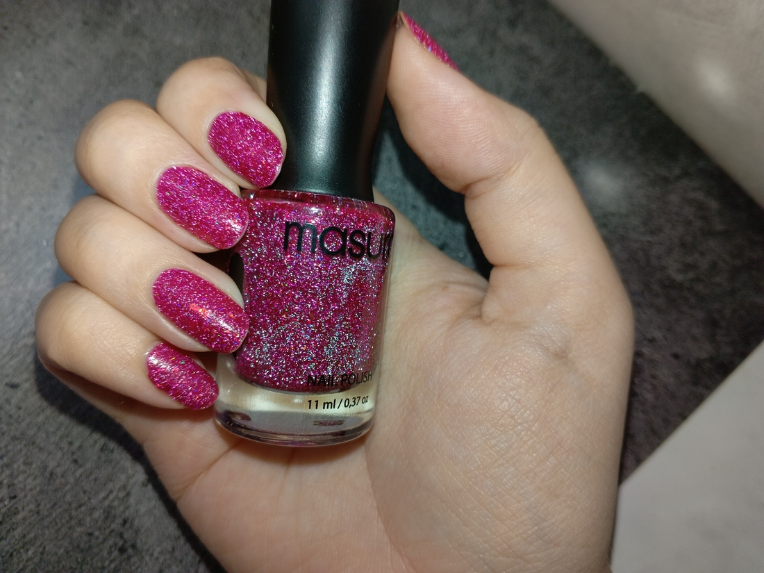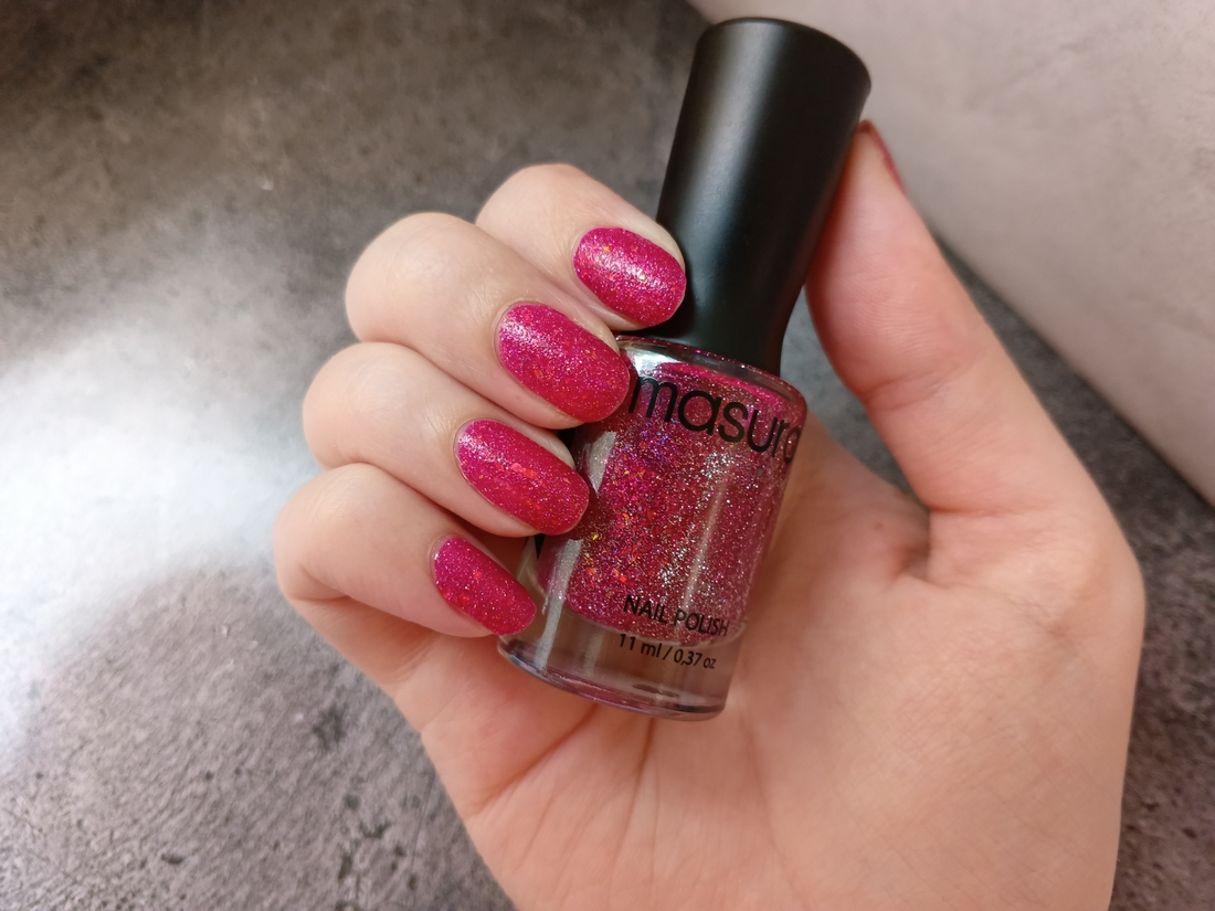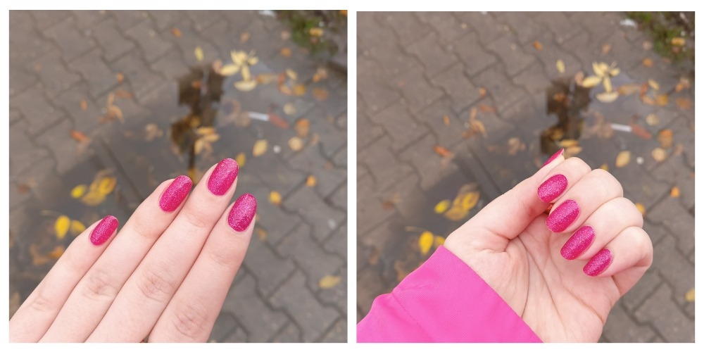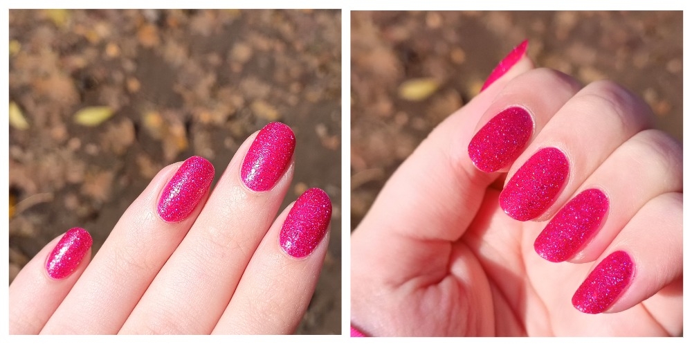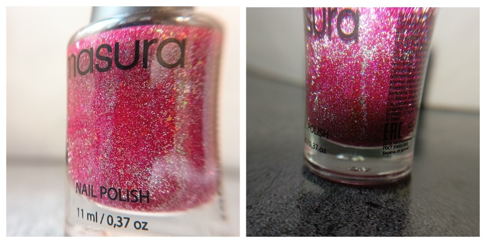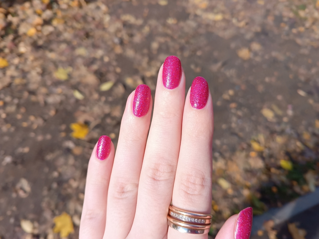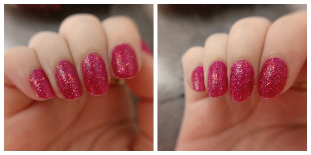 Оттенок заявлен как малиновый с мультихромной слюдой и голографическим светоотражающим глиттером. Я согласна с описанием. На коллаже ниже слева лак в дневном освещении, справа снят со вспышкой, чтобы показать светоотражающую текстуру.