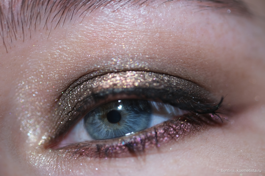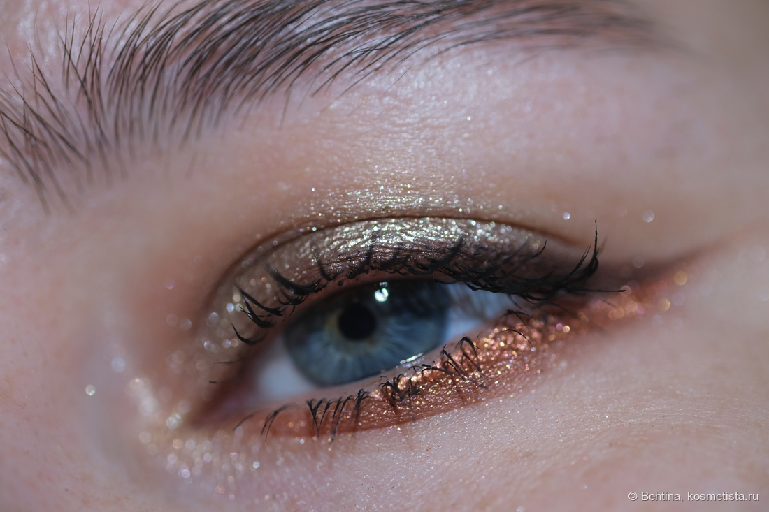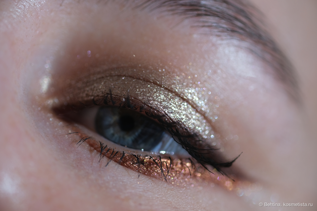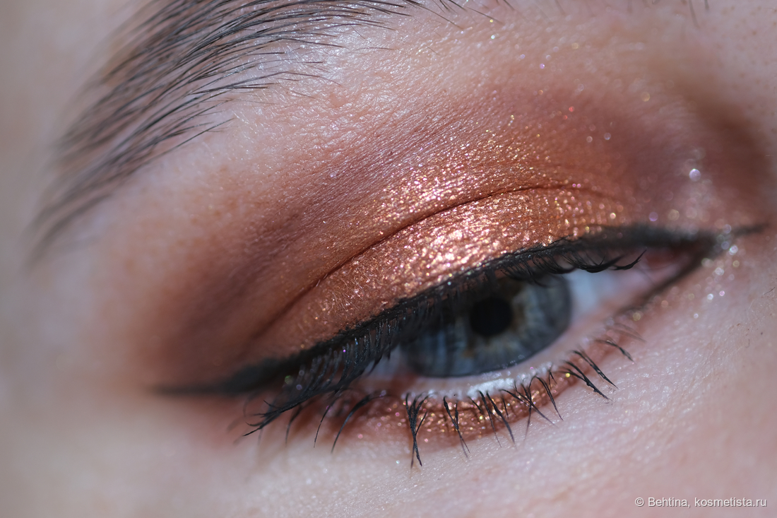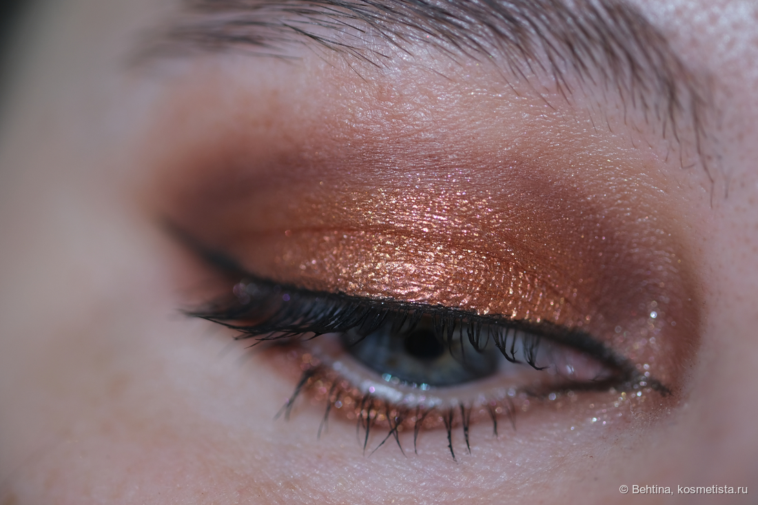 Очень яркий медно-персиковый металлик, почти фольга. Содержит золотые и розовые мелкие белстки. Насыщенный и плотный, может скукожить веко, но в качестве акцента смотрится ярко.