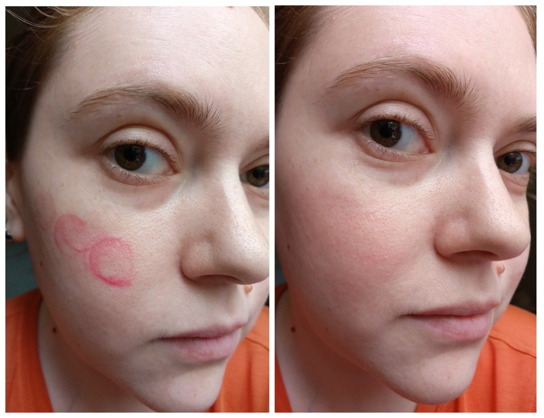 Я предпочитаю поставить три отпечатка на щеку прямо из стика. (На коллаже ниже слева) Потом растушевываю пальцами, можно и кистью, но мне пальцами удобнее. Румяна не переползают на пальцы, а аккуратно сливаются с кожей. Финиш приглушённый, без блеска и без глянца, но живой, естественный. (На коллаже ниже справа) оттенок похож на мой натуральный морозный румянец. Можно сделать его ярче, а можно бледнее. Наслаивается отлично. Текстура податливая, румянами очень просто работать.