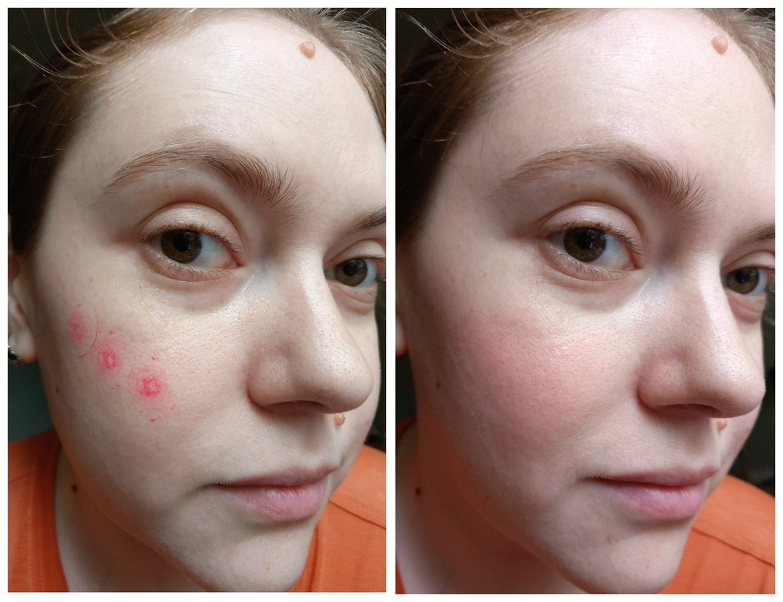 Я наношу в три касания (на коллаже ниже слева) затем растушевываю пальцами (на коллаже ниже справа), можно растушёвывать кистью. А спонжем лучше не пробовать, он сильно съедает оттенок. На пальцах остается часть румян, потому что они довольно долго фиксируются, а лучше их чем-нибудь припудрить или закрыть сухими румянами в тон. Есть легкое сияние, оно мне нравится, смотрится очень славно.