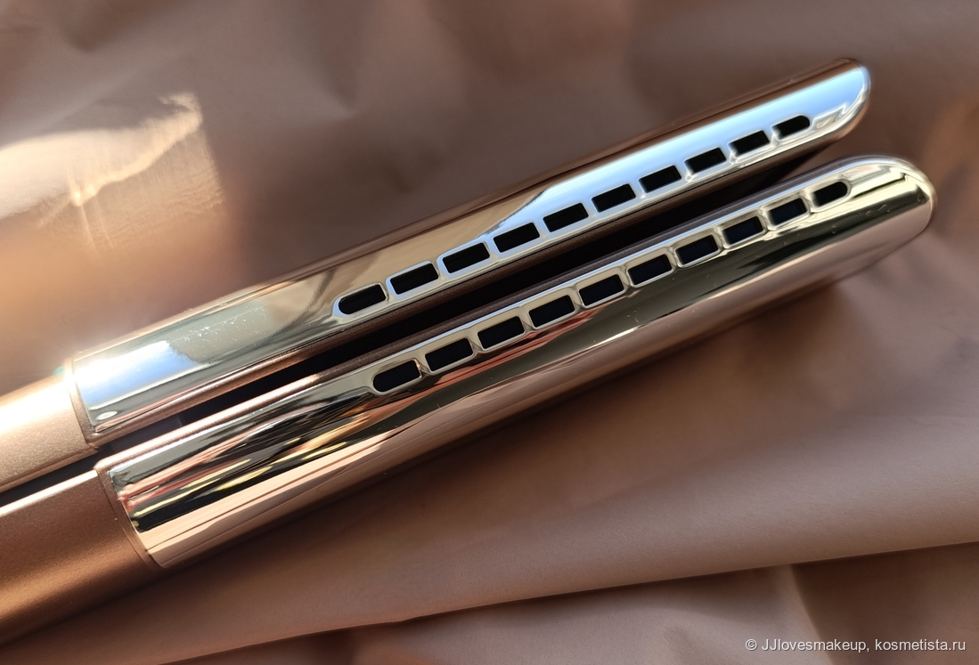 Переходим к золотистой части, это рабочая поверхность, она же «улучшенная конструкция камеры с 6 отверстиями и 5 зонами», которая «гарантирует сбалансированный поток воздуха и направляет воздух по специальным каналам, чтобы эффективнее выпрямлять волосы». С каждой стороны прибора по десять отверстий для подачи воздуха, в раскрытом состоянии поток слабее, в закрытом сильнее, если закрыть и зафиксировать в этом положении, получится фен.