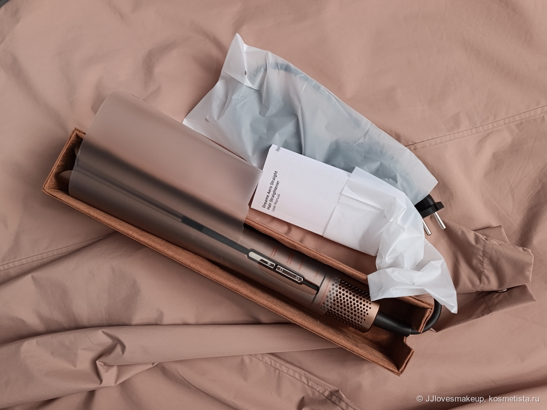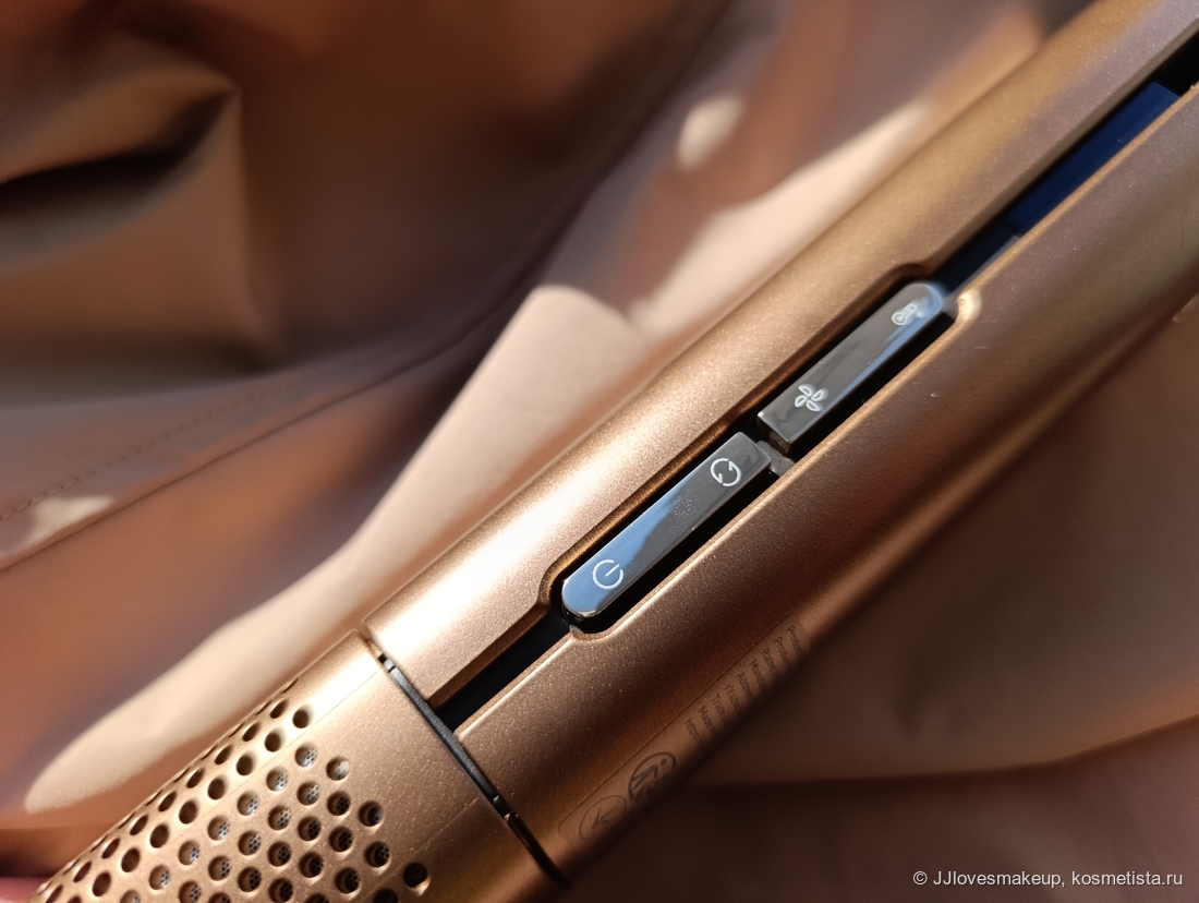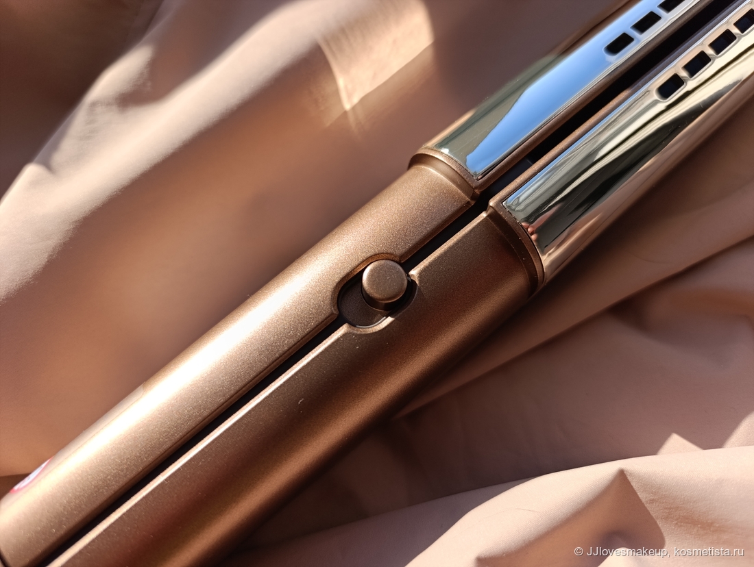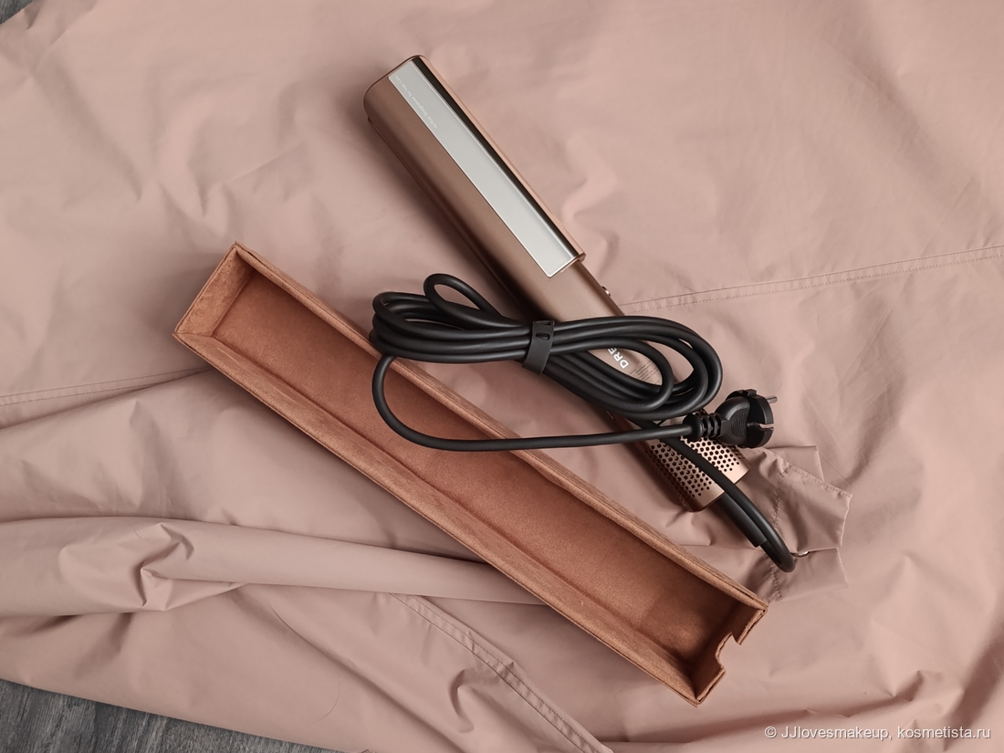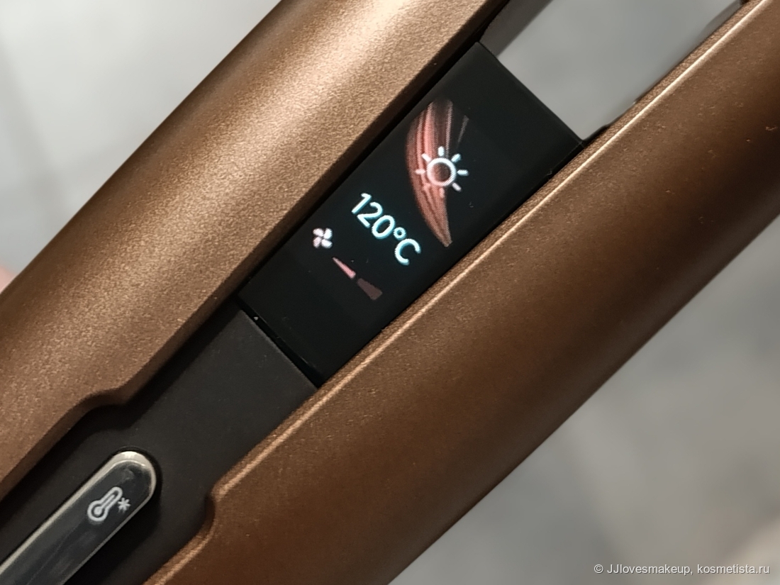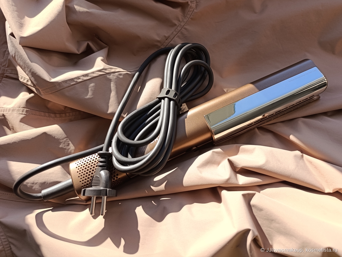 Сам выпрямитель того же тёмно-ирисочного цвета с чёрным шнуром и золотой вставкой. Коричневая часть гладкая, но не слишком, в руках лежит дорого, а вот блестящая часть мне сперва не понравилась своим глянцем, но после пары дней я к ней привыкла, в искусственном освещении ванной она выглядит гармоничнее. И это единственное, за что можно зацепиться, так как выпрямитель выглядит и ощущается основательно, дорого, определенно отличается от бюджетных приборов для укладки волос. Пока он не включен, он обманчиво выглядит как выпрямитель для волос с греющими пластинками, по крайней мере я очень удивилась, когда выбрала режим и услышала шум воздуха.