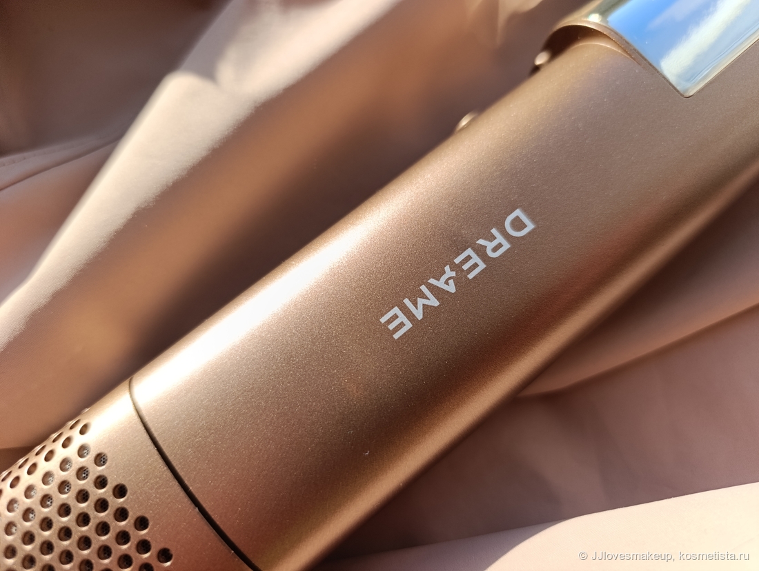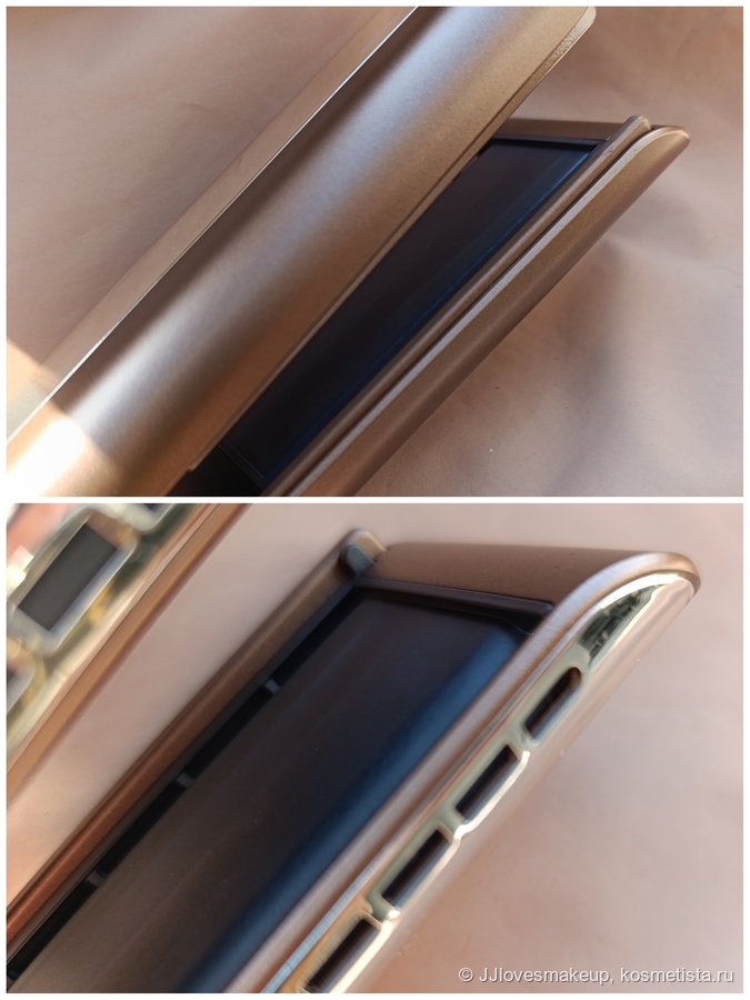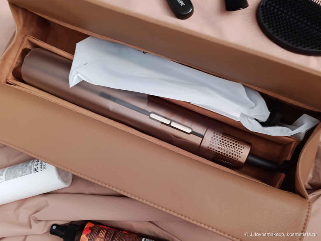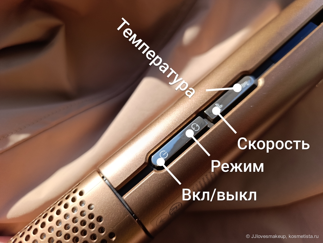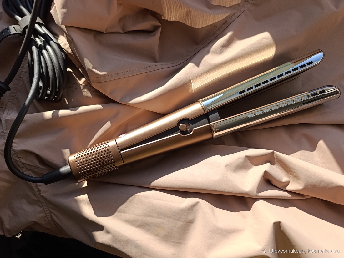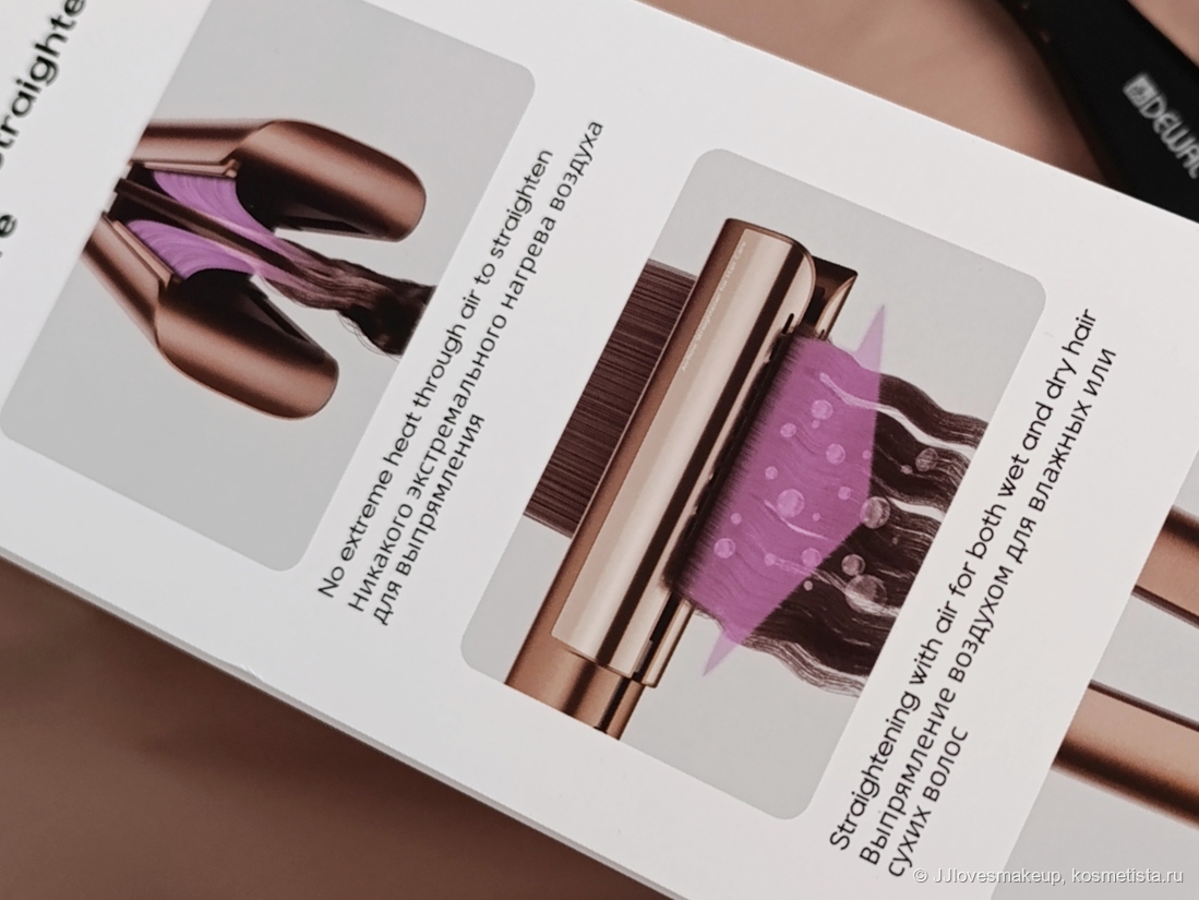 Сам выпрямитель того же тёмно-ирисочного цвета с чёрным шнуром и золотой вставкой. Коричневая часть гладкая, но не слишком, в руках лежит дорого, а вот блестящая часть мне сперва не понравилась своим глянцем, но после пары дней я к ней привыкла, в искусственном освещении ванной она выглядит гармоничнее. И это единственное, за что можно зацепиться, так как выпрямитель выглядит и ощущается основательно, дорого, определенно отличается от бюджетных приборов для укладки волос. Пока он не включен, он обманчиво выглядит как выпрямитель для волос с греющими пластинками, по крайней мере я очень удивилась, когда выбрала режим и услышала шум воздуха.