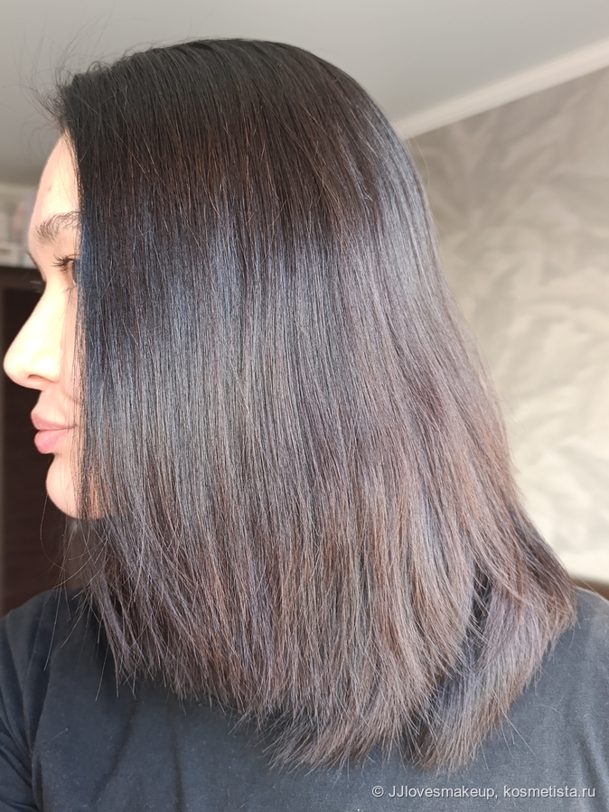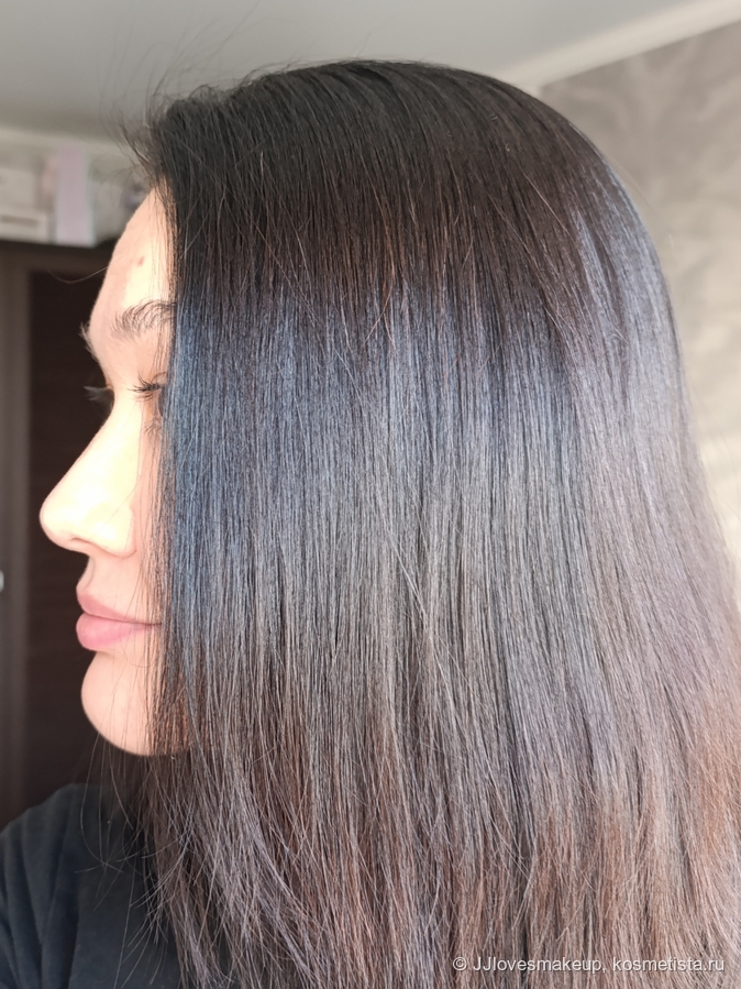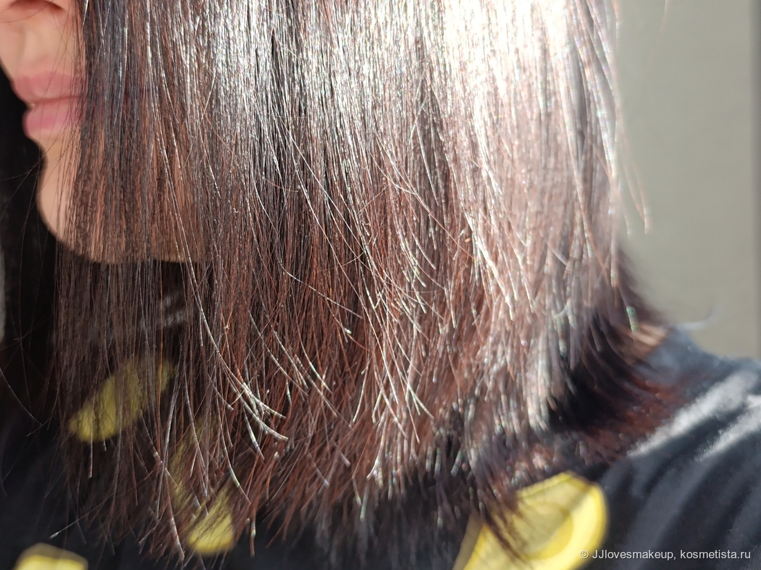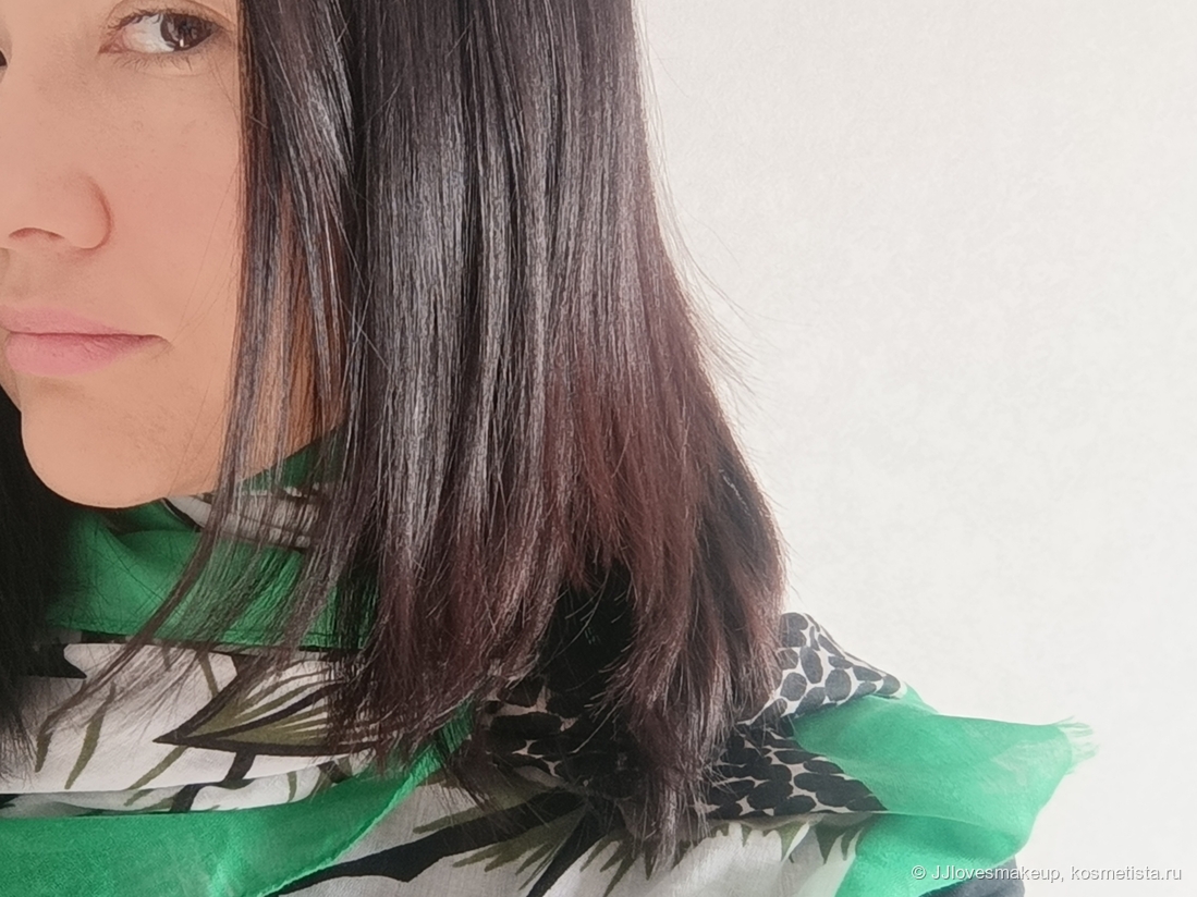 Как видим, волосы прямые, но смотрятся естественно, никакого яркого блеска или супер-ровных прядей. Волосы просто имеют форму и лежат в заданном направлении. Держится этот эффект хорошо, на мне- сутки, до следующего мытья головы. Выпрямленные волосы отлично собираются в упругий хвостик, не выбиваются из резинки и даже смотрятся объёмнее у корней.