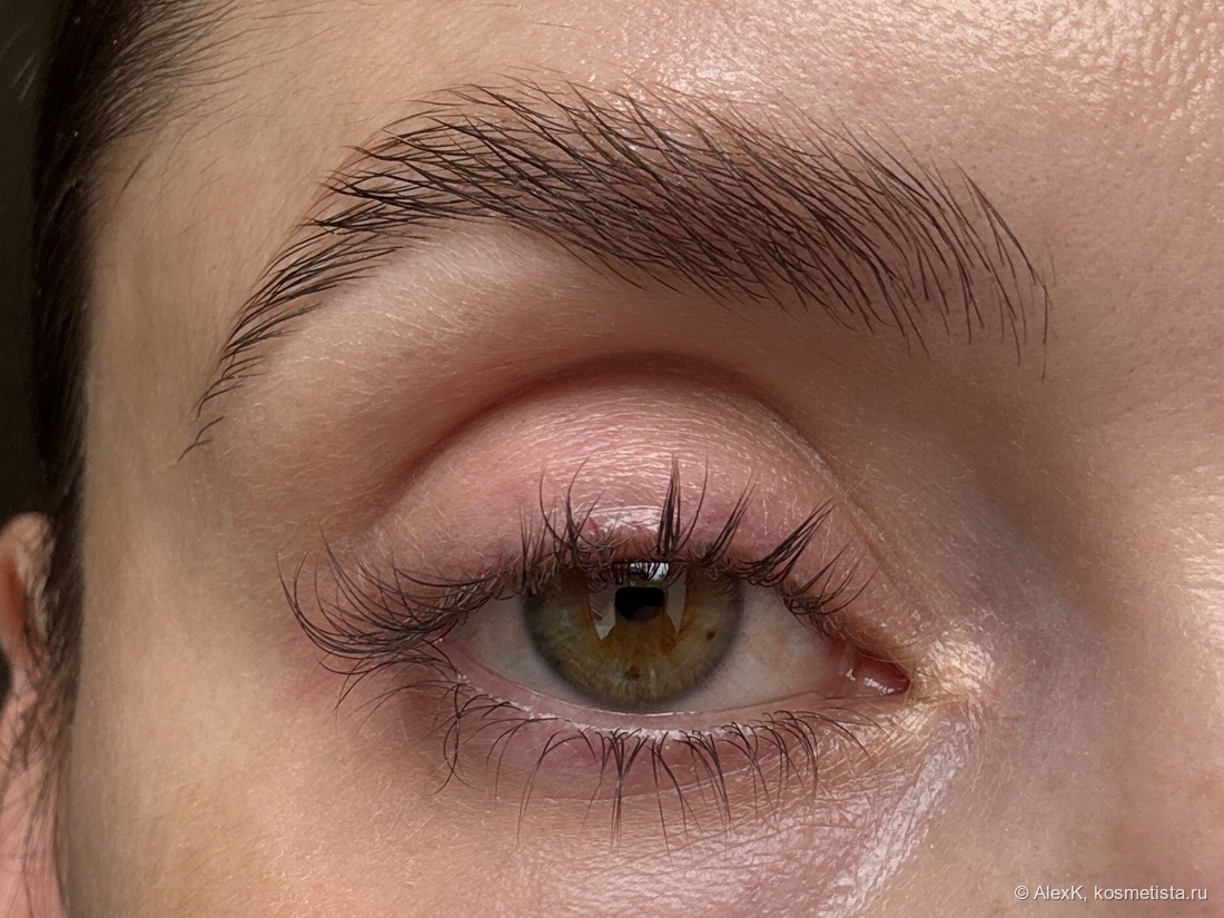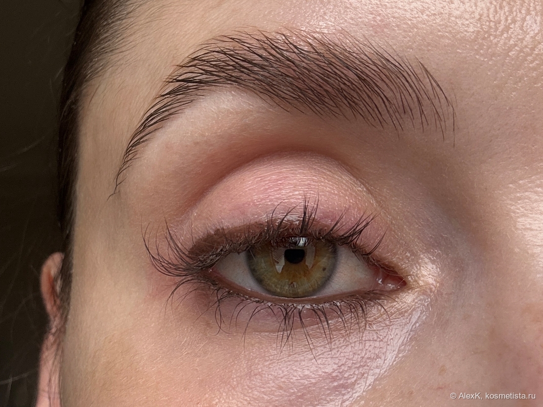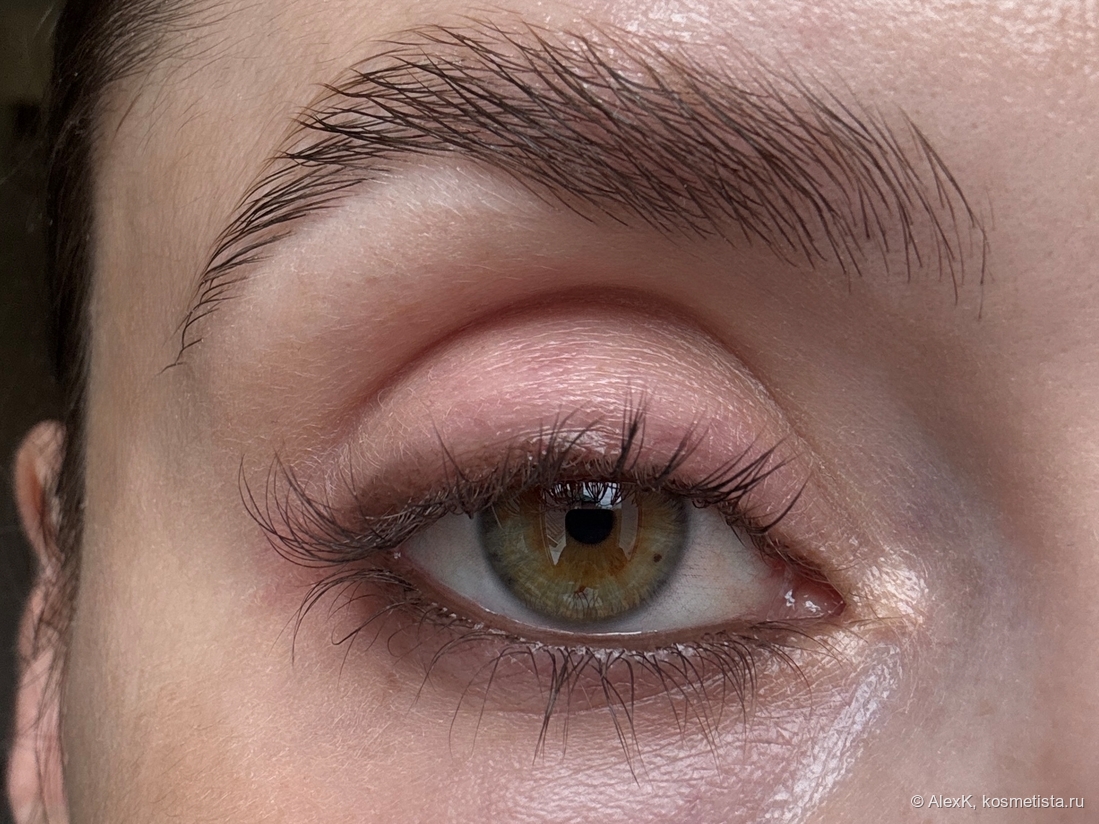 Под бровь наношу хайлайтер Порошок ртутной луны Тамми Танука. Убираю тейп и крашу ресницы тушью RBG Калина.