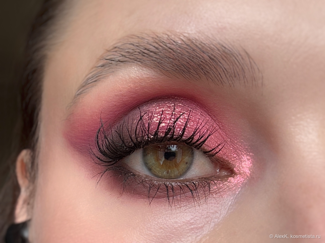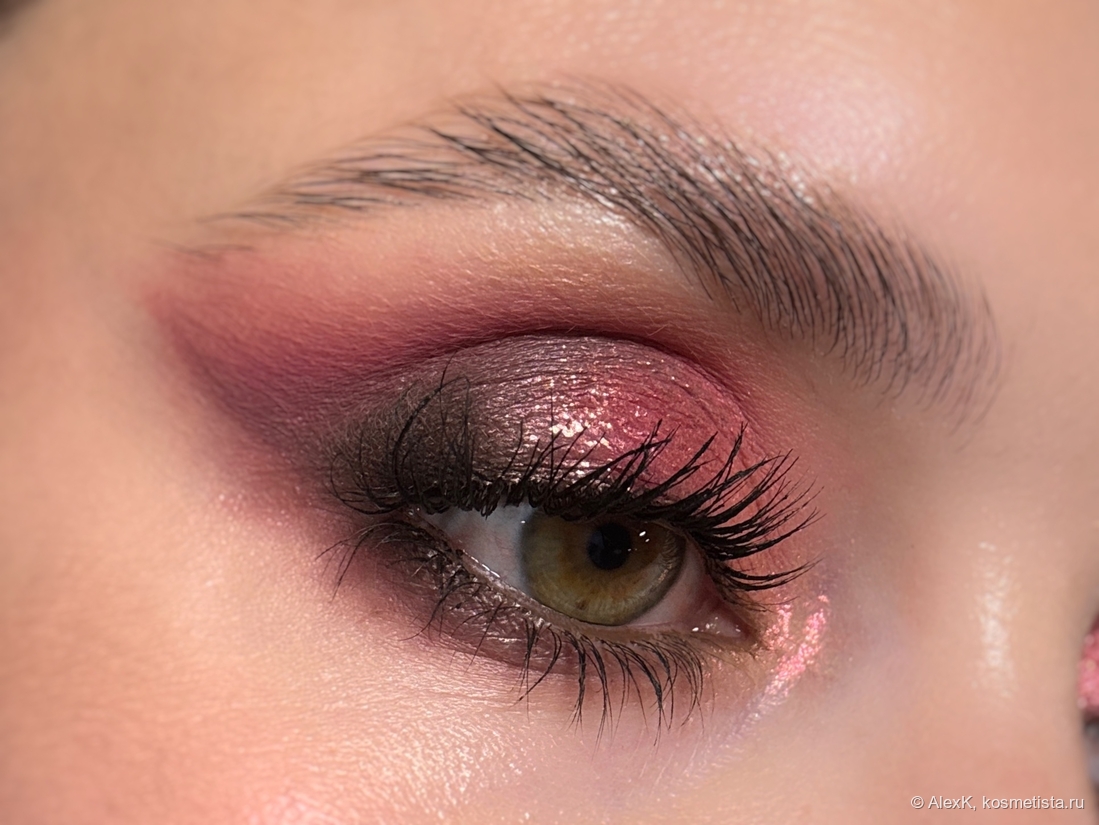 На внутреннюю часть подвижного века наношу розовый сатин 157 Дуновение июня. На внешнюю сторону — рассыпчатый тёмно-коричневый сатин Вольная наемница. И немного стушёвываю два оттенка.
