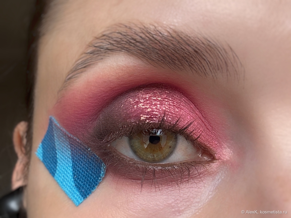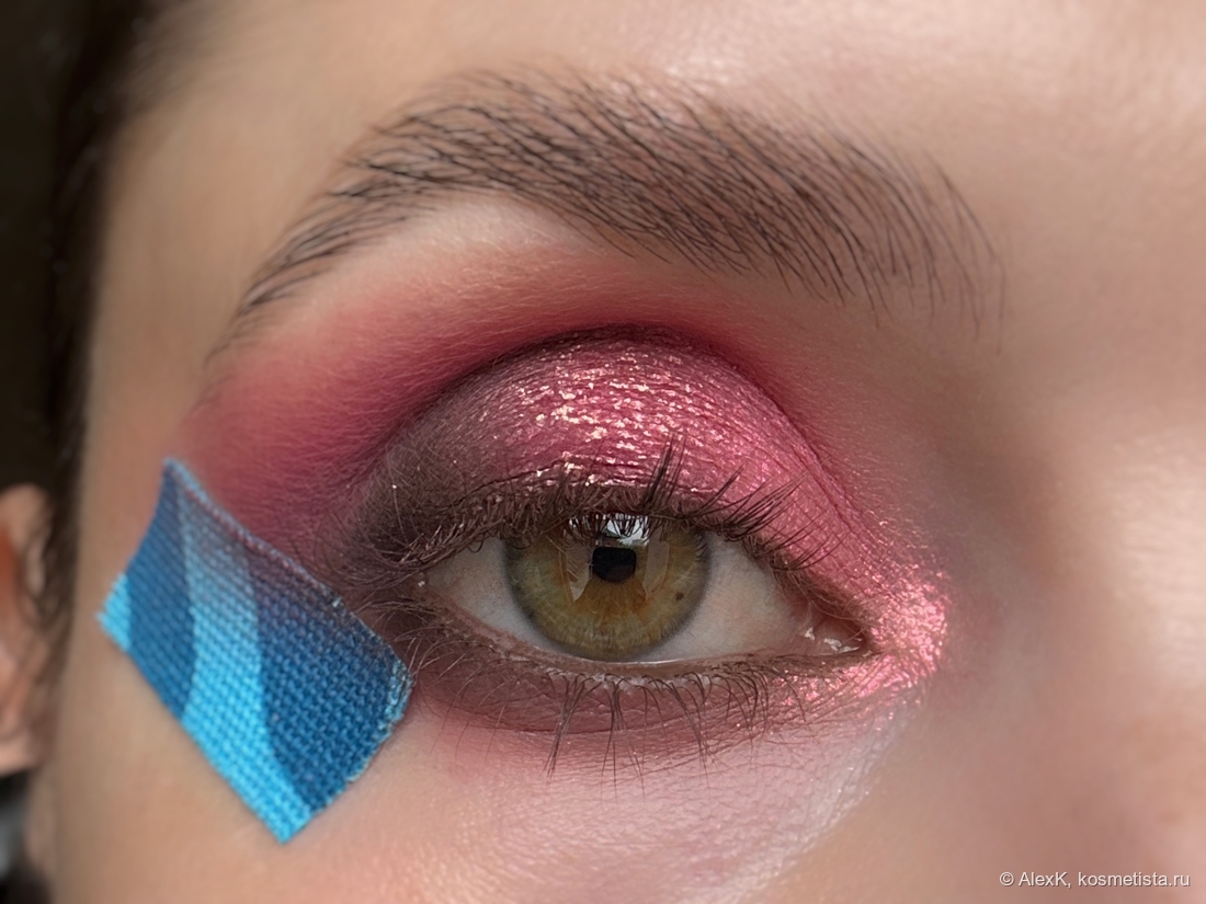 Прячу неравномерный переход из розового в коричневый под слоем блесток: леплю слюду Презирающая опасности на клей для глиттера по центру века.