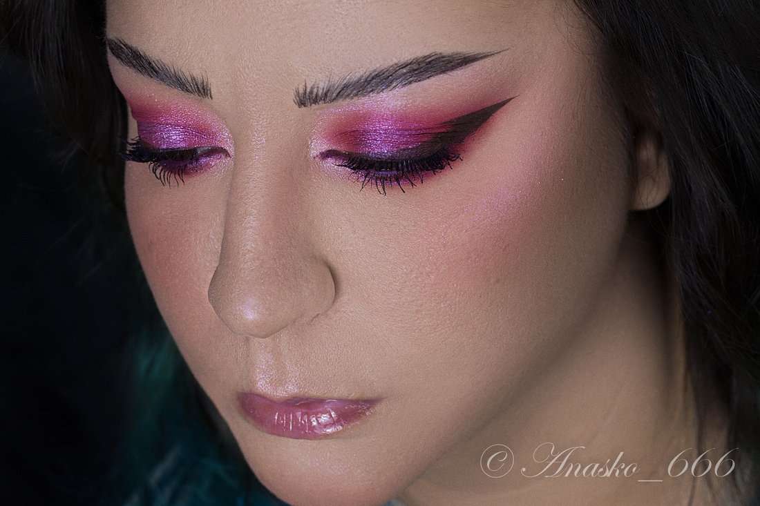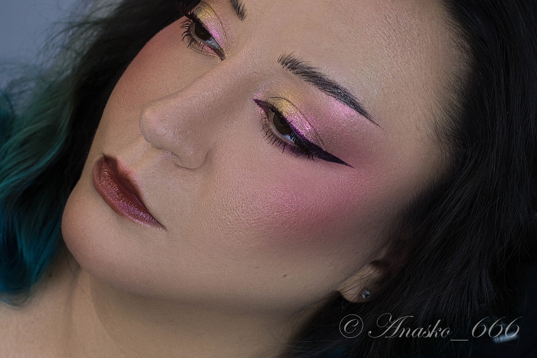 Итоговый макияж, на лице прошлась пудрой, контуром и очень активно розовым хайлайтером