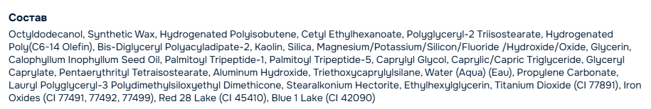 Румяна пришли в небольшой картонной коробочке. На ней сверху можно было увидеть номер оттенка, а сбоку прочесть информацию о главных действующих веществах (то есть пептидах), описание продукта и состав.