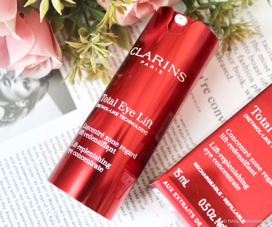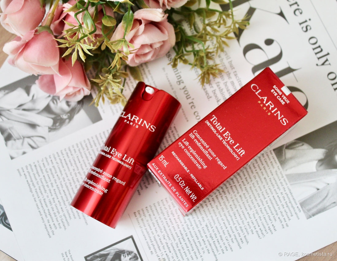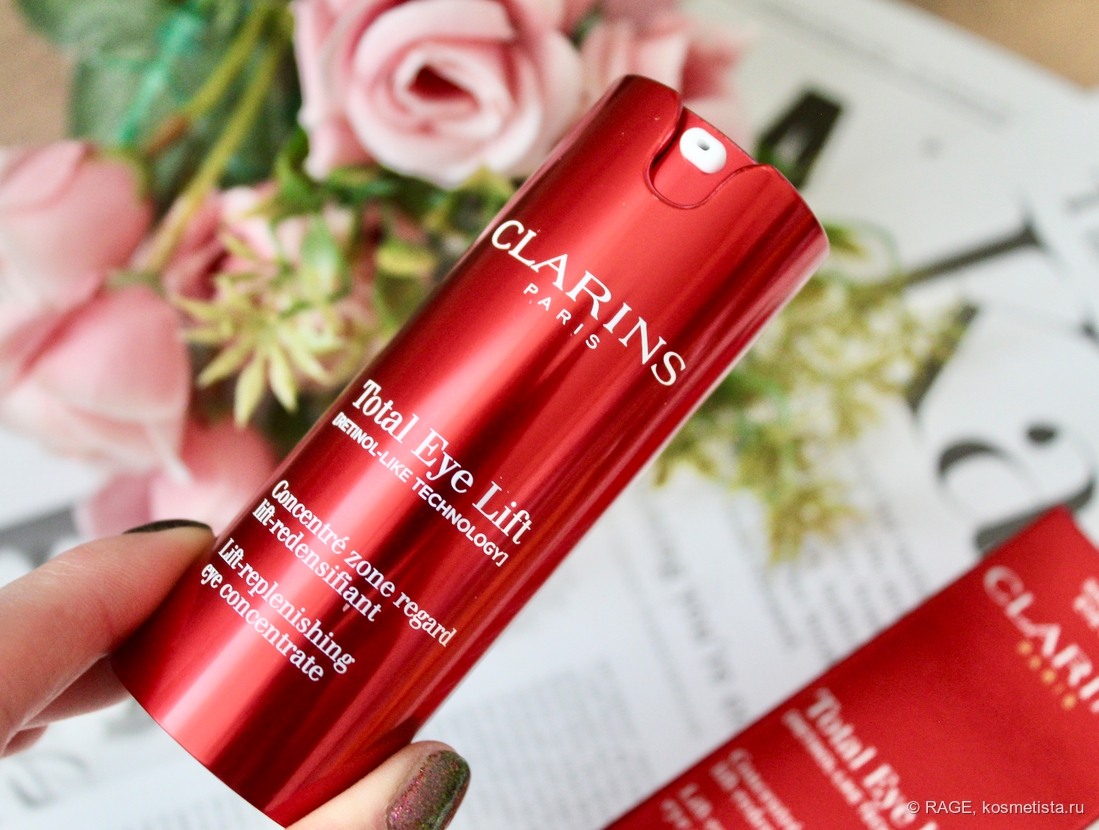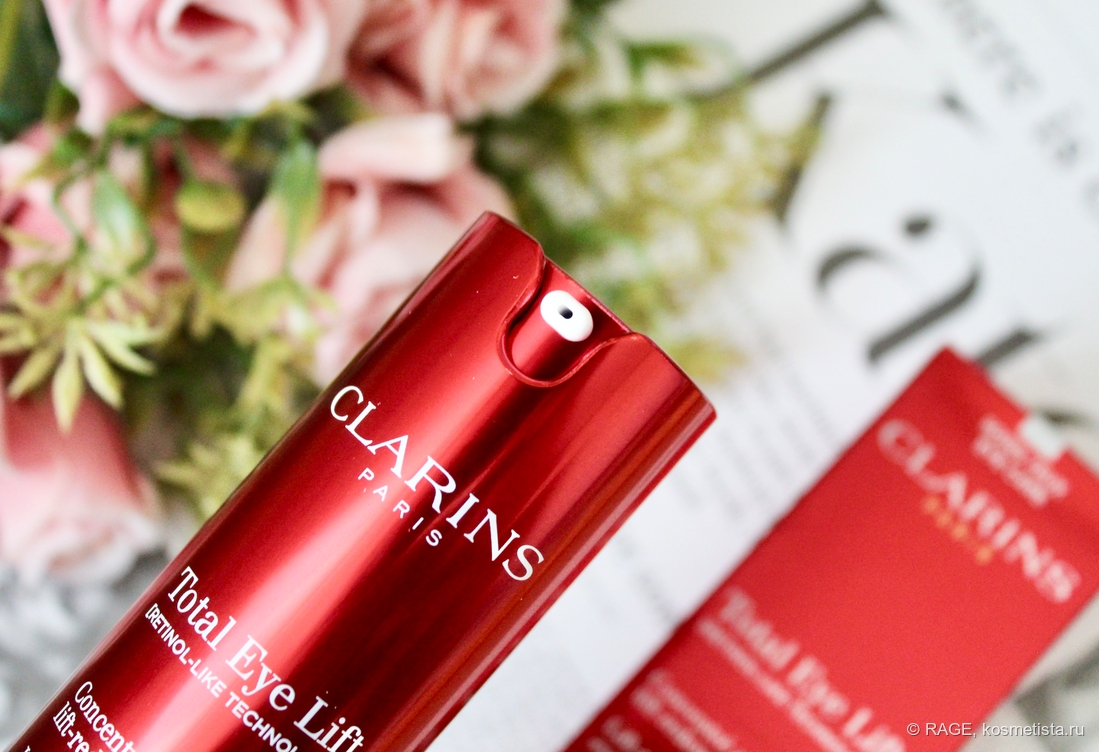 Clarins Total Eye-Lift Lift-Replenishing Eye – концентрат для ухода за кожей вокруг глаз с увлажняющим, подтягивающим и анти-эйдж эффектом. В составе есть растительный аналог ретинола, пептид (уменьшение глубины морщин + лифтинг), пантенол (увлажнение + смягчение), кофеин (уменьшение отёков) и силиконы (разглаживание кожи).