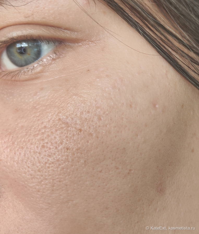 Ну другое дело же! Цвет ровный, живой, а не серо-зеленый. Финиш у тонального крема матовый, но в моем случае это ненадолго, к сожалению — кожа моего лица вырабатывает столько жирка, что я подумываю открыть смазочный завод. А что насчет проблемных мест? А вот что: