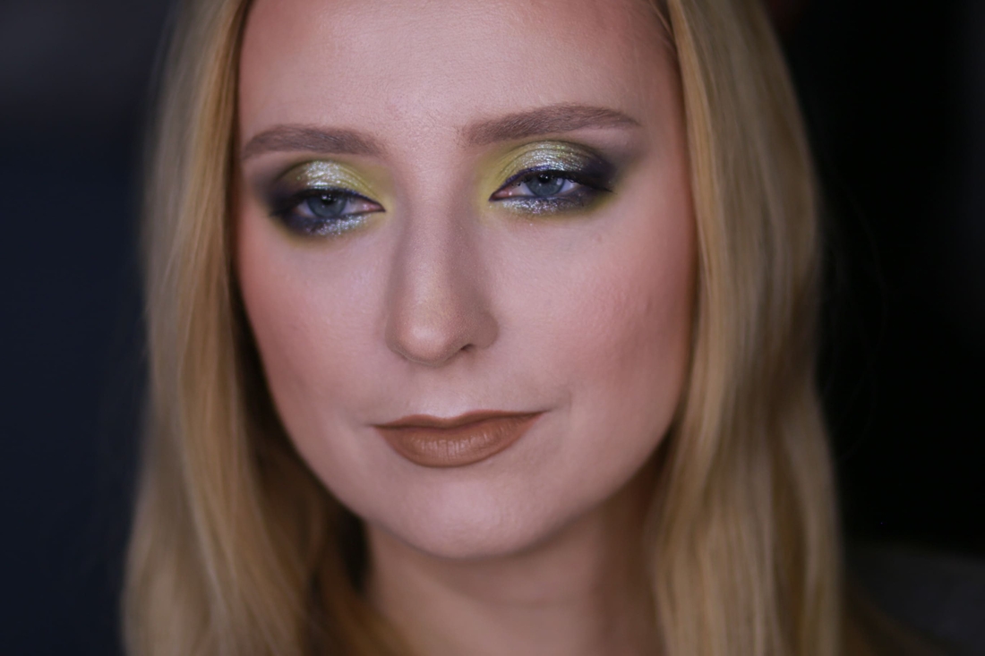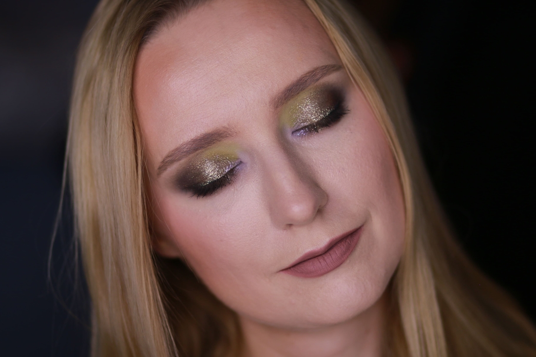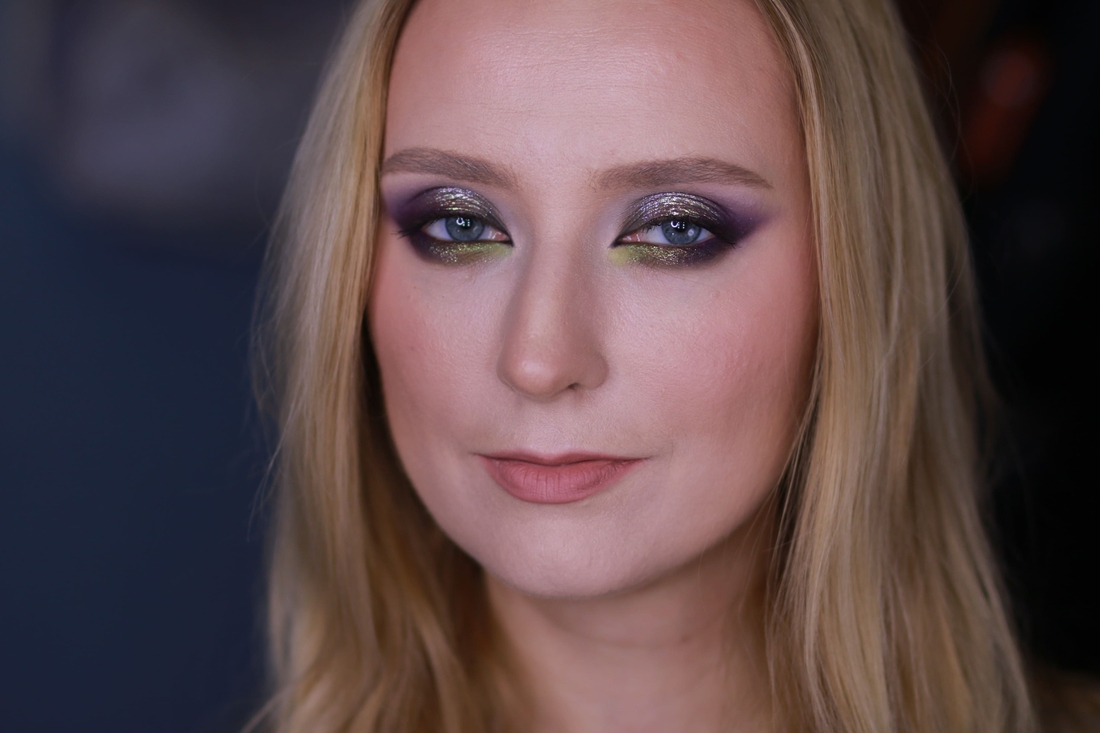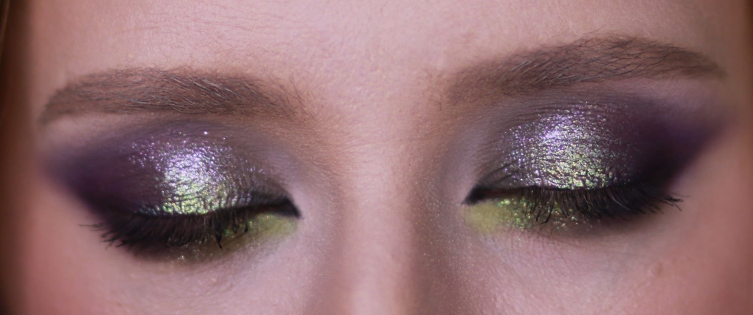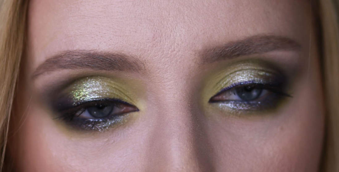 Мейк номер раз. Первым делом меня привлёк нейтральный металлик справа во втором ряду, и я хотела сделать что-нибудь приличное, просто с салатовым нюансом, сиреневым акцентом и сиянием из космоса