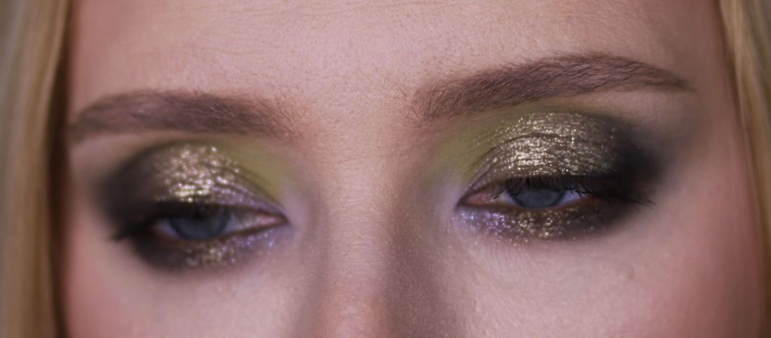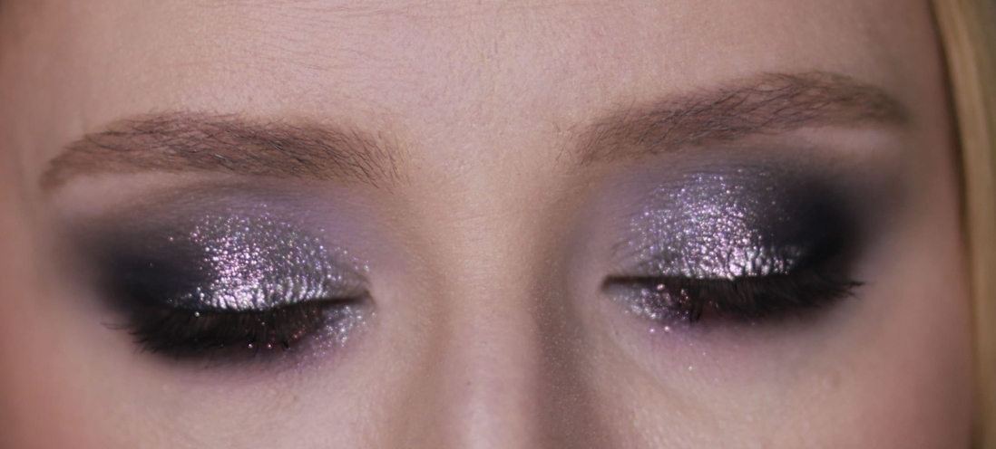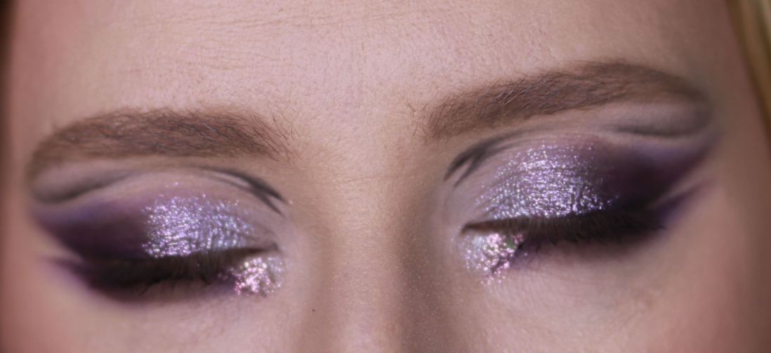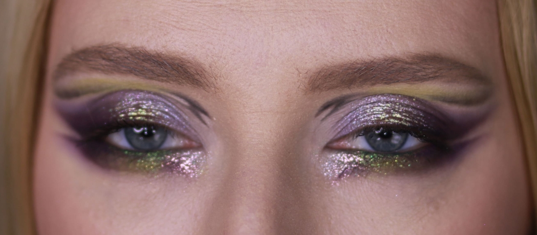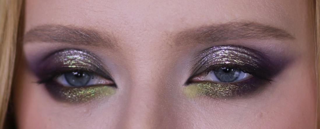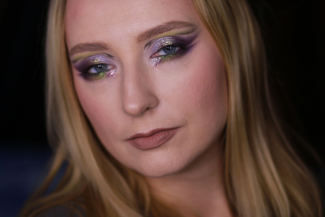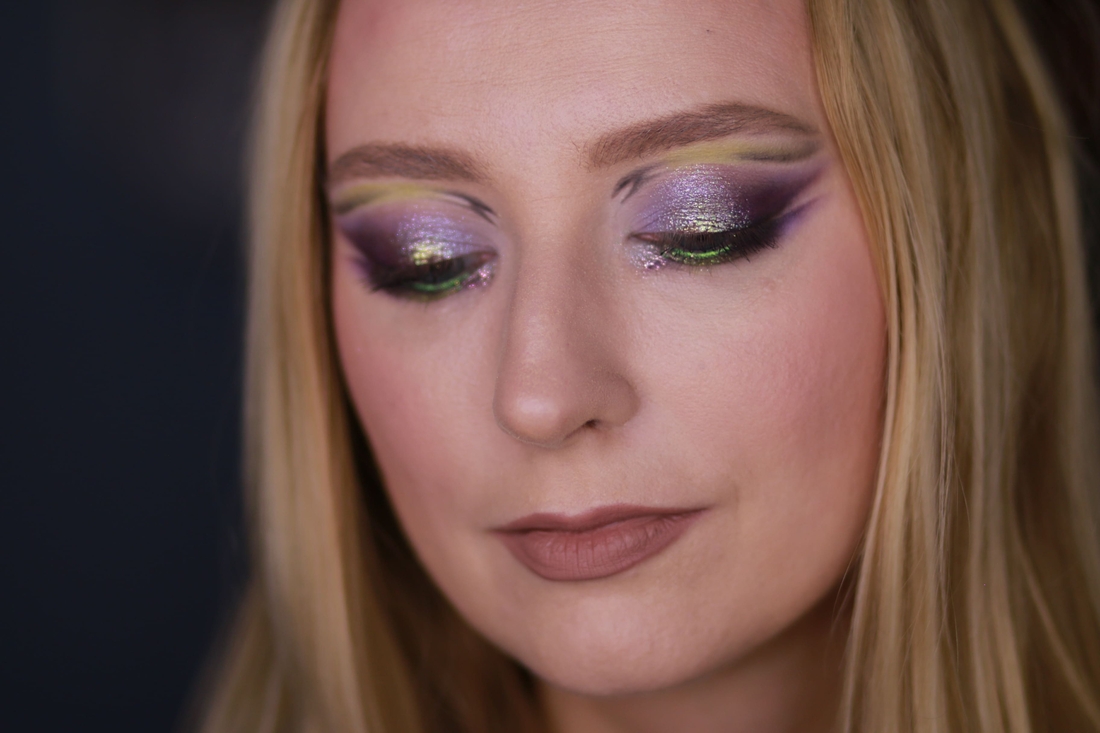 Мейк номер раз. Первым делом меня привлёк нейтральный металлик справа во втором ряду, и я хотела сделать что-нибудь приличное, просто с салатовым нюансом, сиреневым акцентом и сиянием из космоса