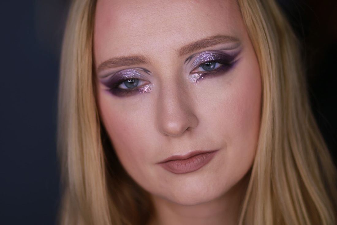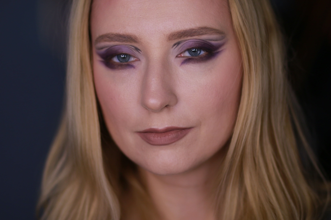 Мейк номер два, а также три и четыре. Так как в палетке очень заметный фиолетовый сегмент, обойти его вниманием было никак нельзя. И дань модной графике надо отдать. Сначала я заготовила матовую базу: